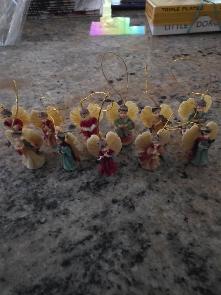 I have a set of angel ornaments. They are decorated with different colored dresses and wings. These would look lovely on a Christmas tree. 11 have loops for hanging and 3 without.