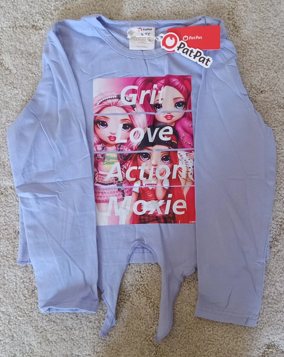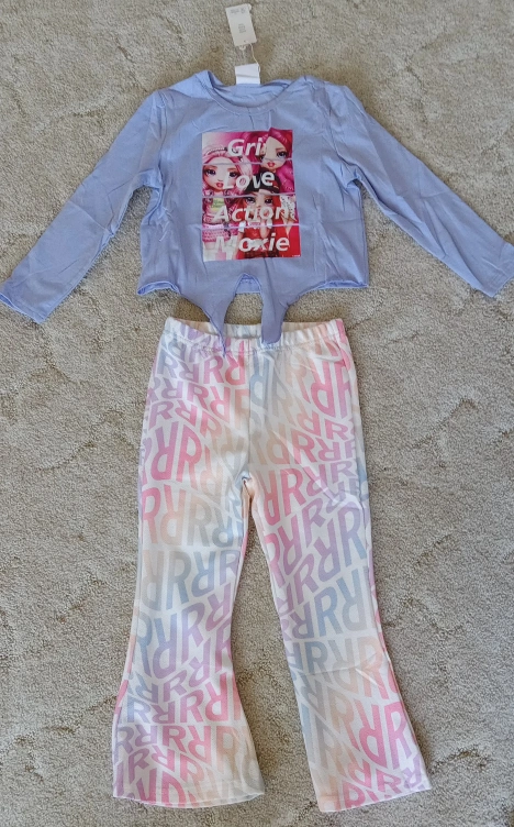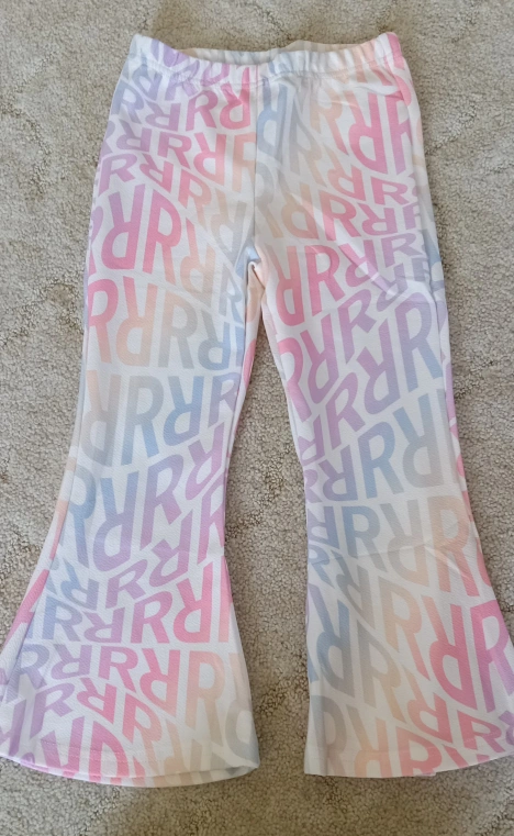 Adorable girl's set. Features a long-sleeved top and flared pants. The top has a graphic design on the front. A fun outfit to wear for a relaxing afternoon playing with friends or just relaxing.