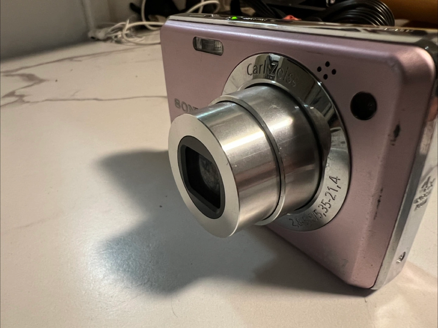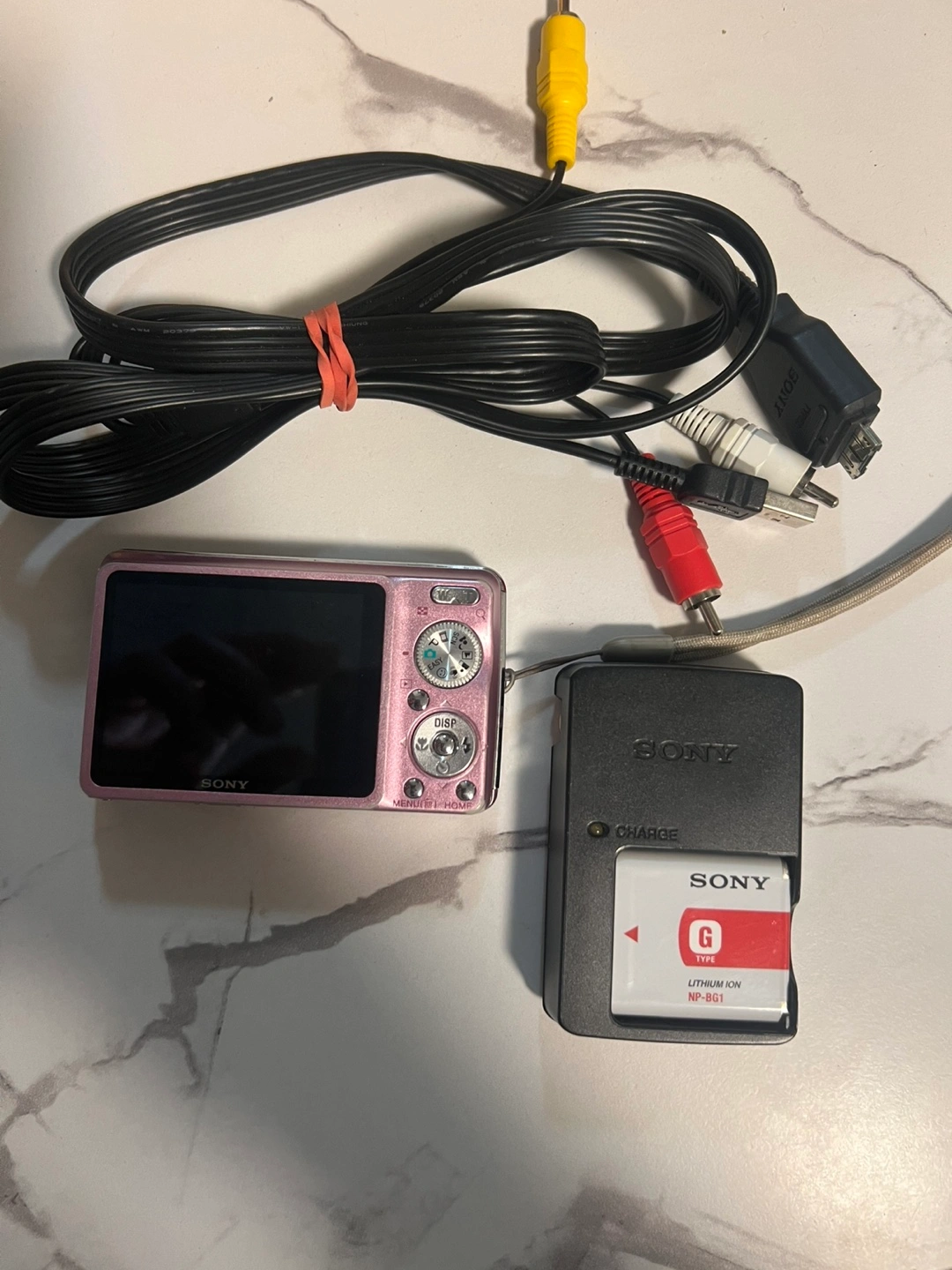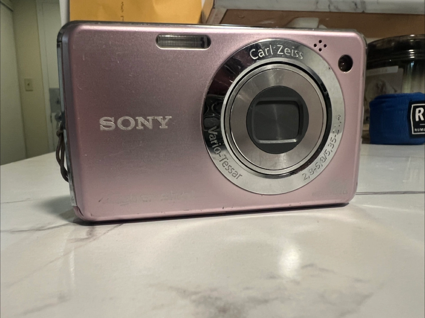 Pink Sony Cybershot digital camera. Includes charger, cables, and battery. Camera featuring the Carl Zeiss lens.