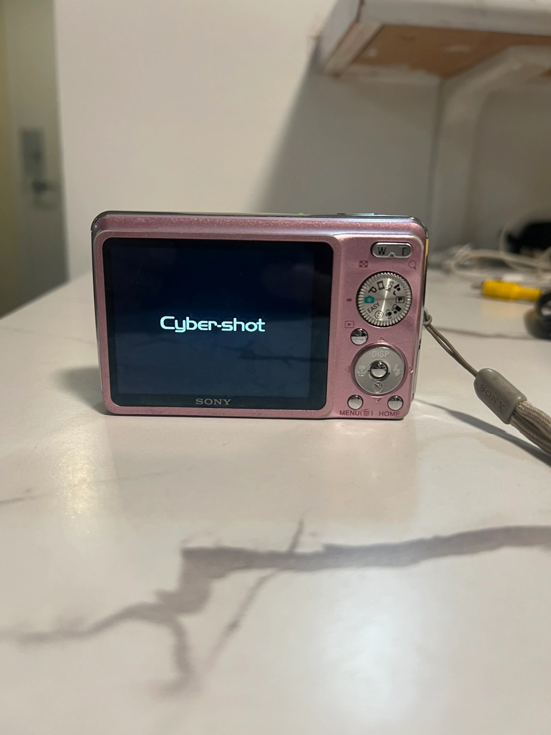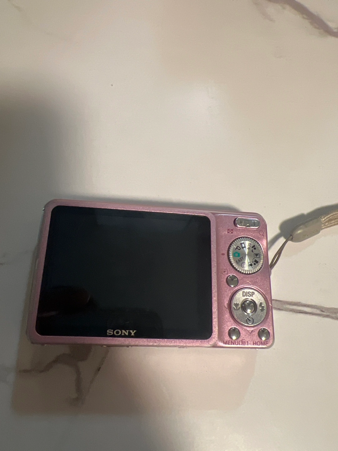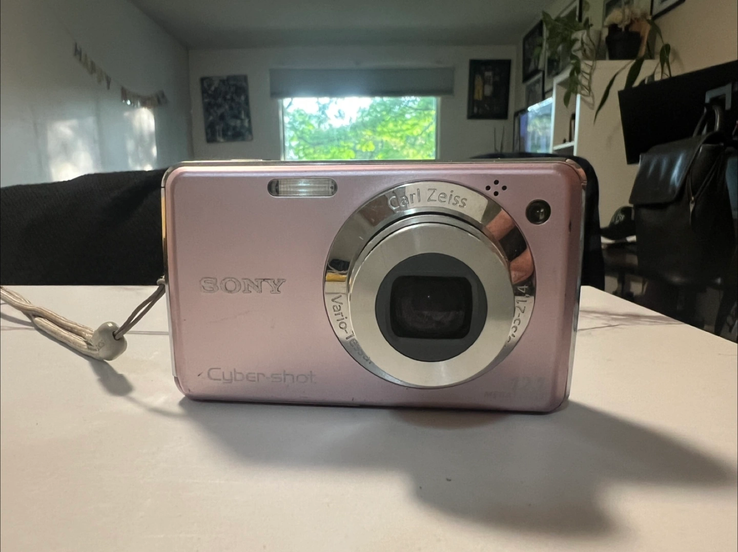 Pink Sony Cybershot digital camera. Includes charger, cables, and battery. Camera featuring the Carl Zeiss lens.