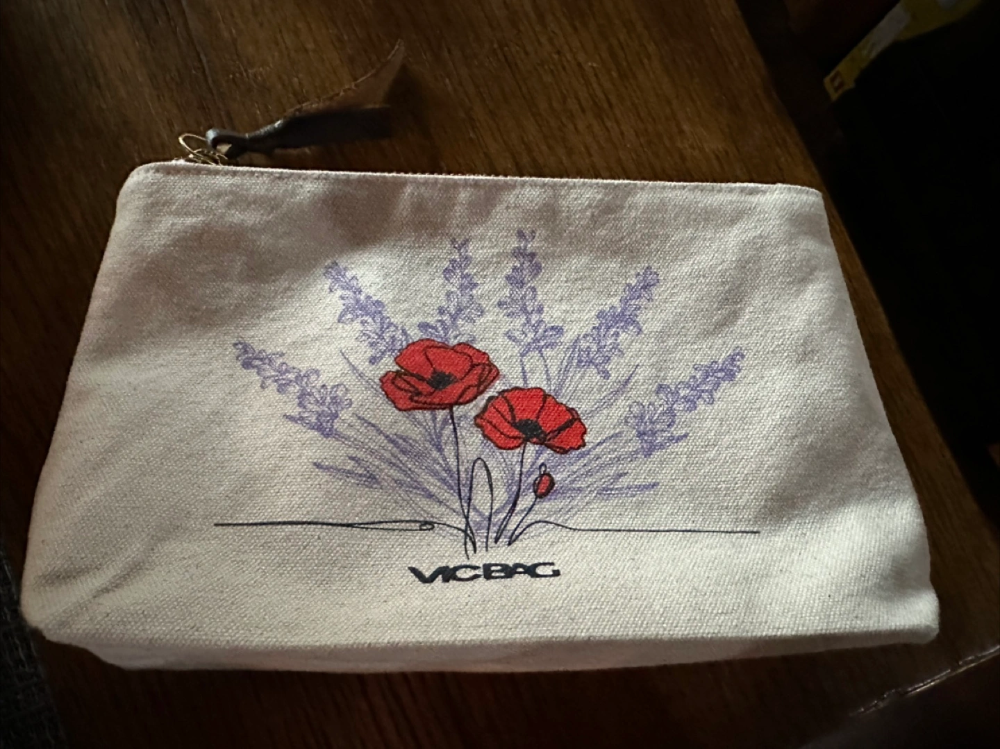 Canvas cosmetic bag. Features a floral design with red poppies and lavender. Zipper closure with a leather pull. This bag would be great for keeping your toiletries organized while traveling or at home.