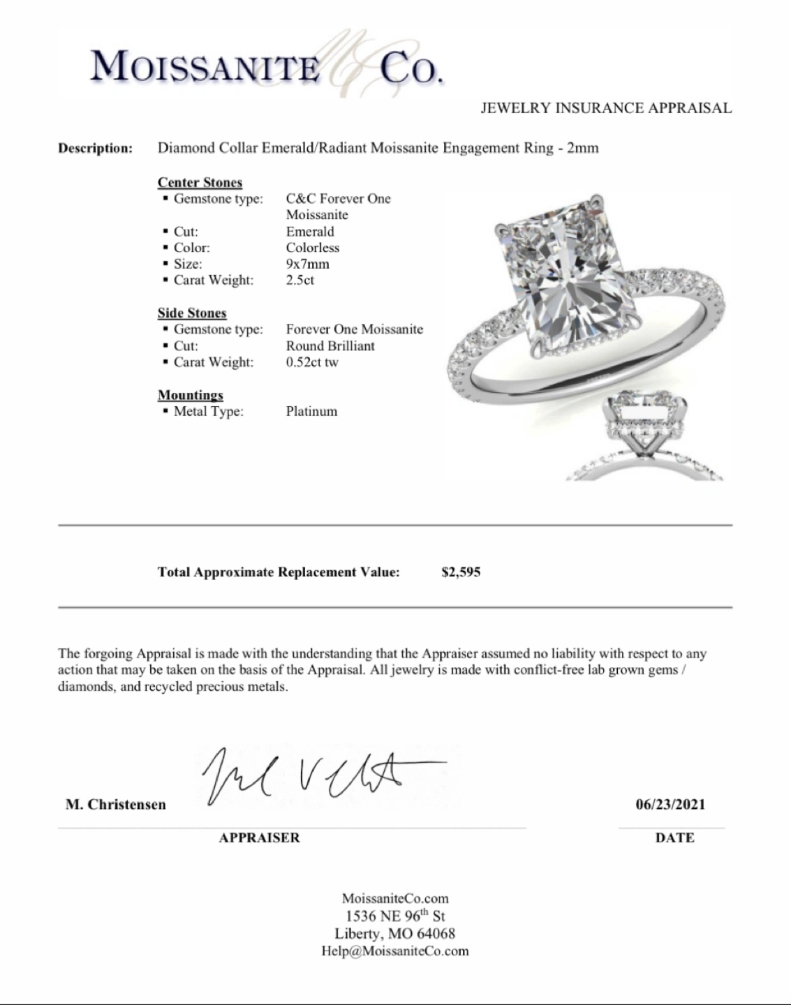Radiant Moissanite engagement ring. Set with a gorgeous center stone, and side stones. A great ring to make any moment special.