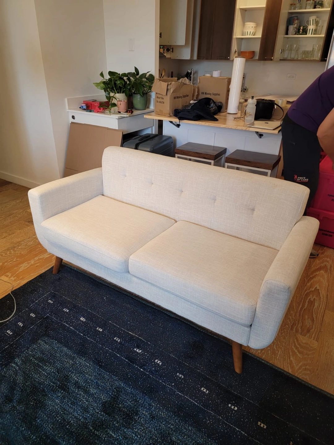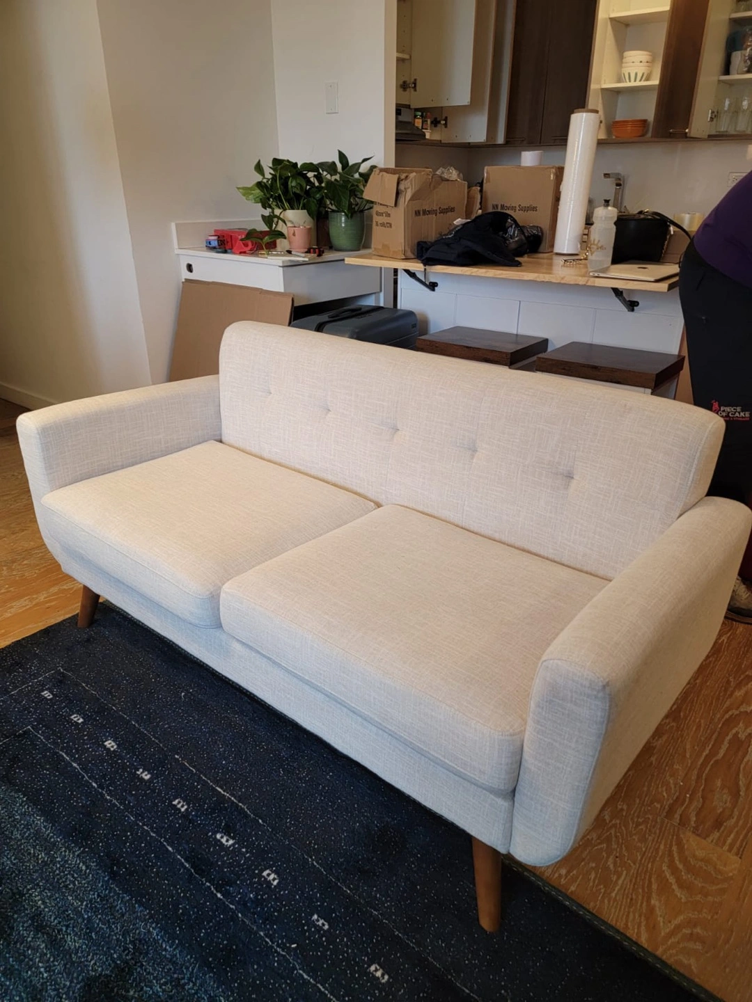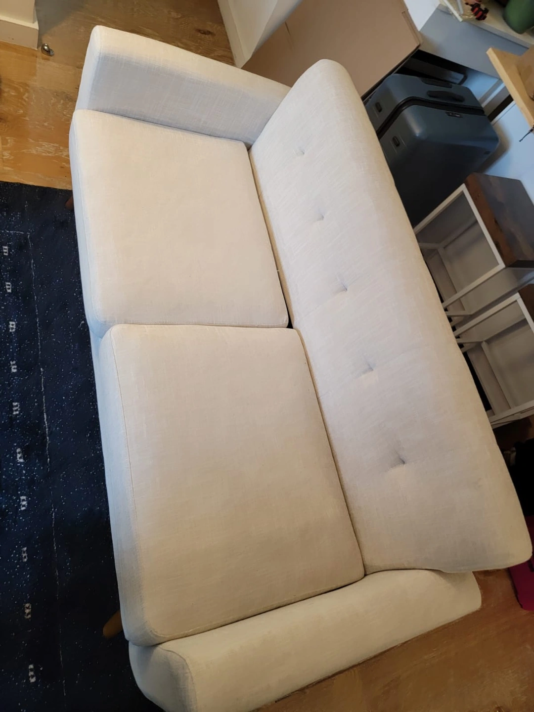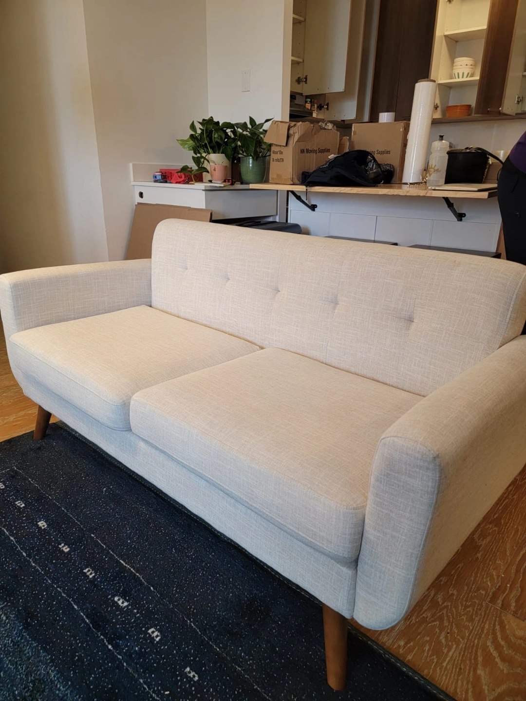 A lovely two-seater sofa. Features button detailing and wooden legs. Soft neutral color. This sofa is a perfect place to unwind after a long day.