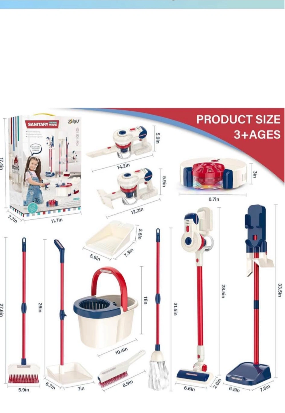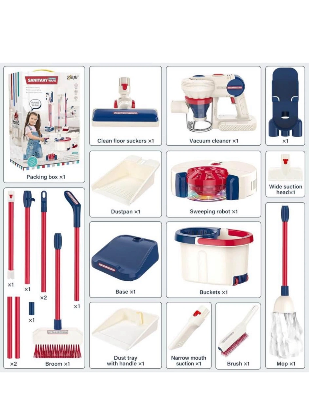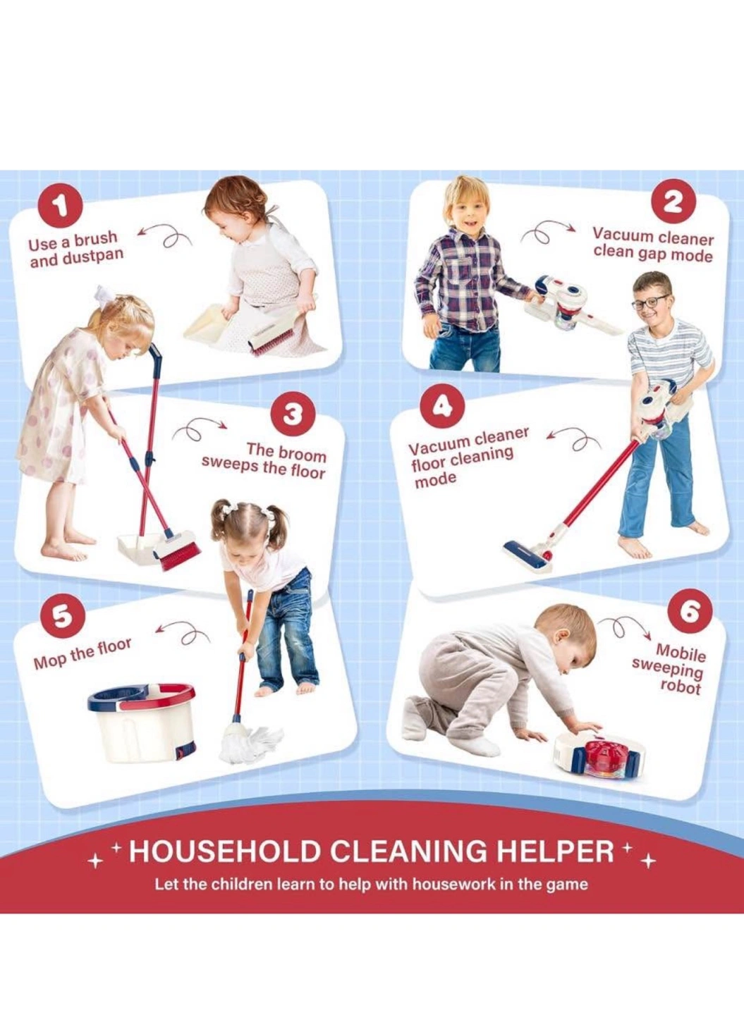 Includes toy vacuum cleaner, broom, mop, dustpan and more. Features red and blue details. Includes everything to create a fun and safe play environment for kids. A great way to encourage children to participate in household chores at an early age.