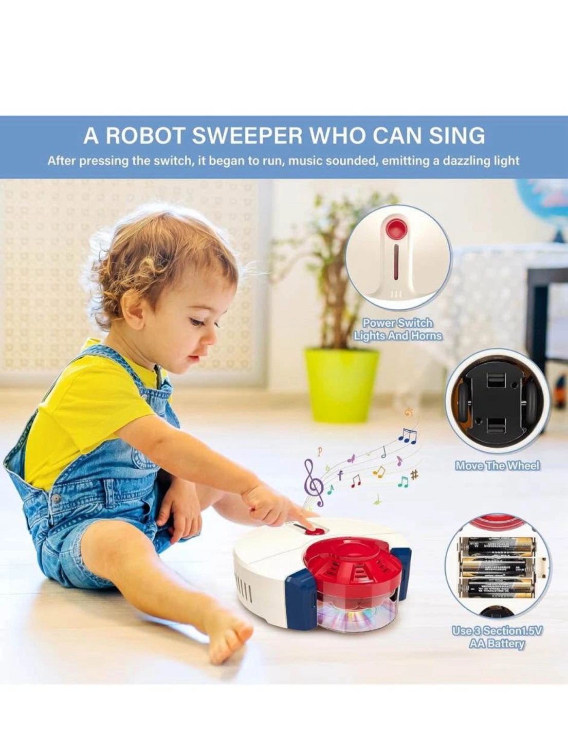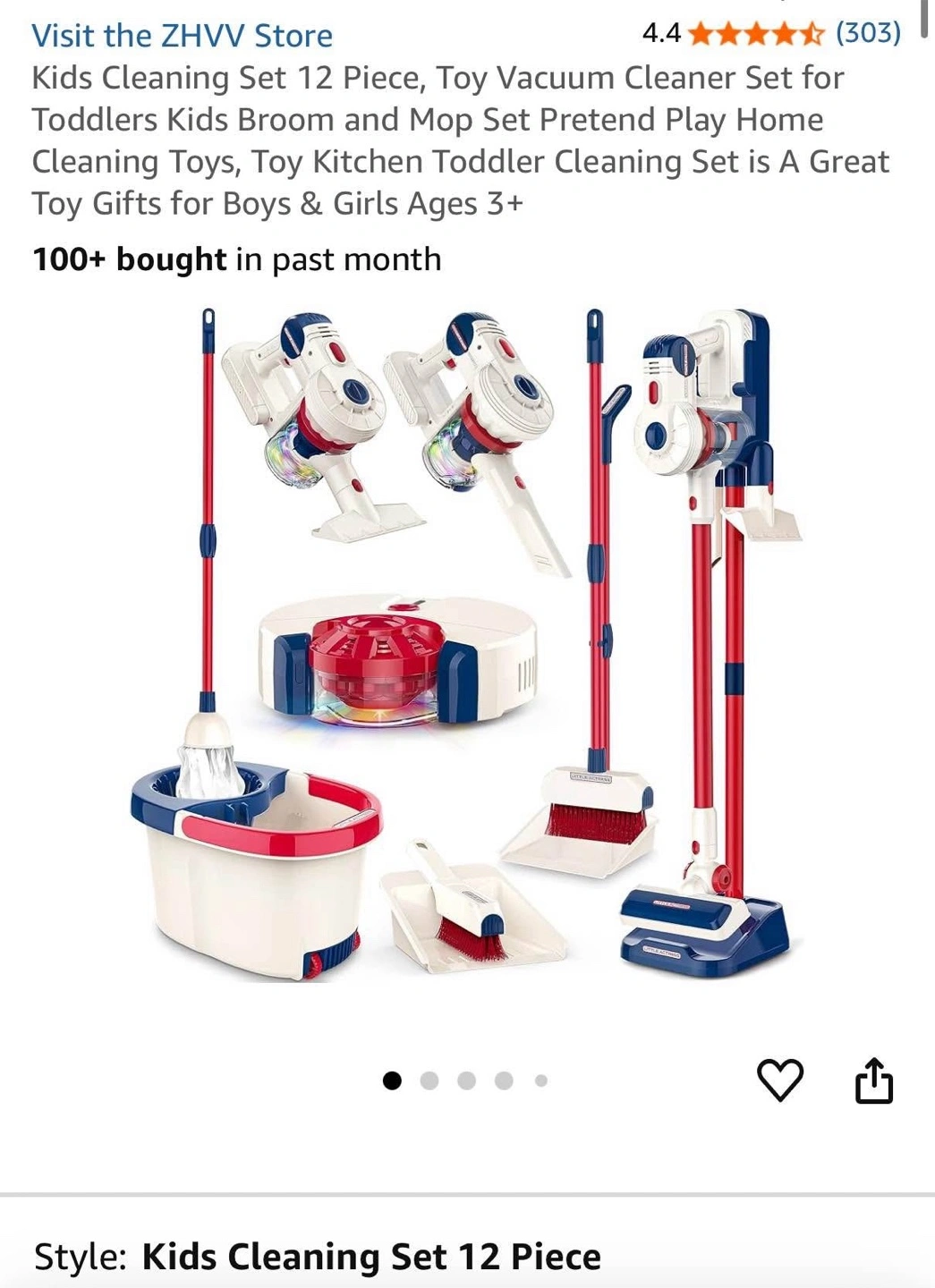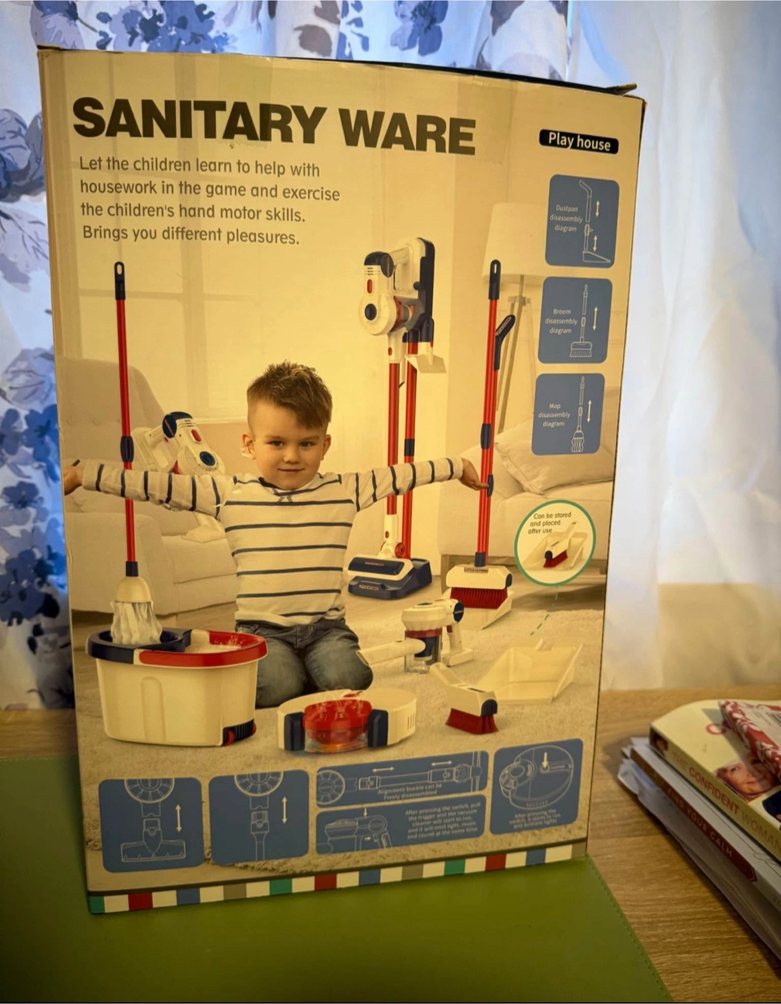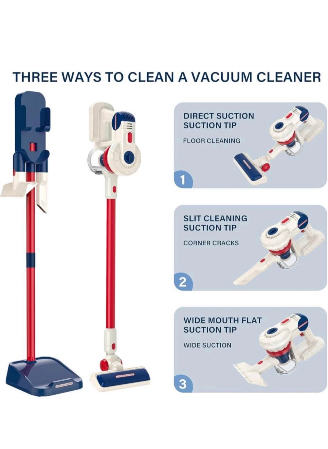 Includes toy vacuum cleaner, broom, mop, dustpan and more. Features red and blue details. Includes everything to create a fun and safe play environment for kids. A great way to encourage children to participate in household chores at an early age.