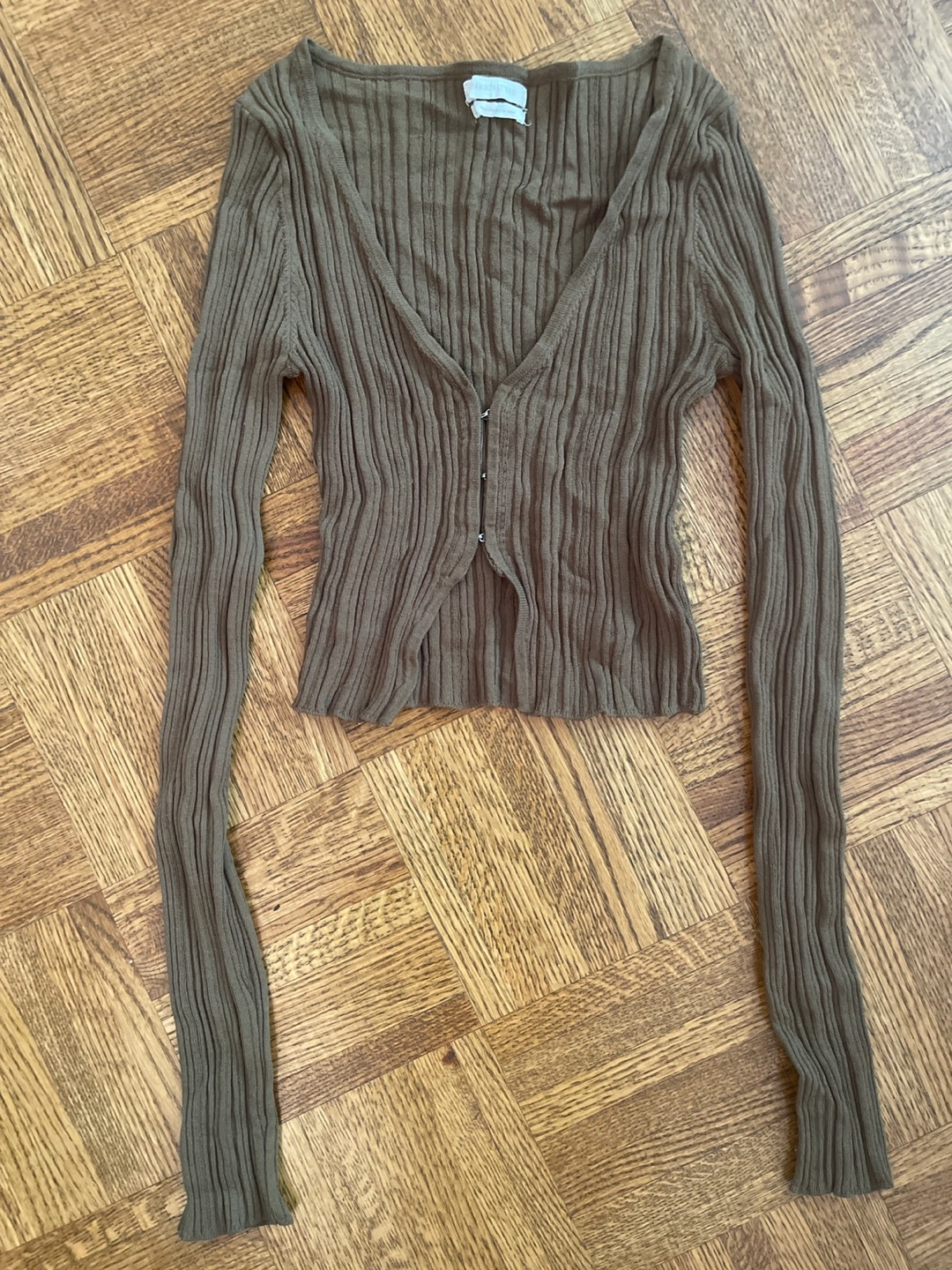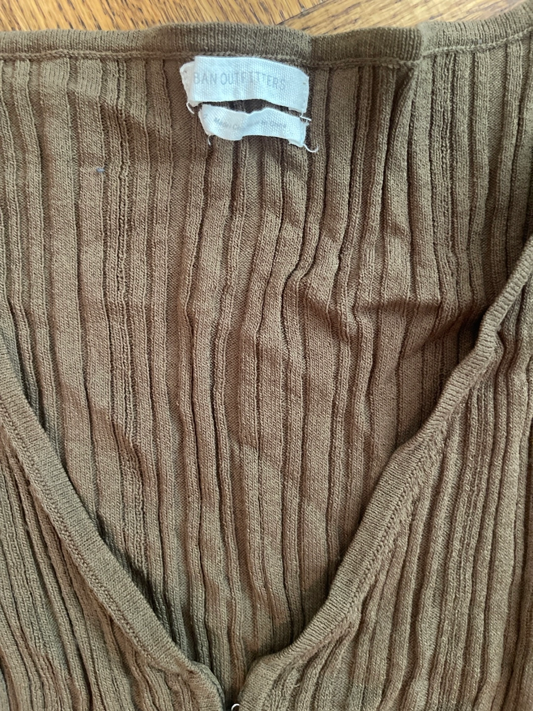 A ribbed, long-sleeved top. Features a V-neckline and a button closure down the center. Can be great for layering, especially in cooler weather.