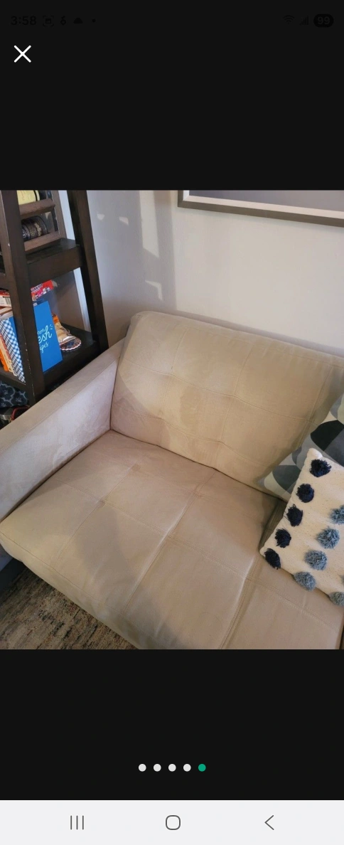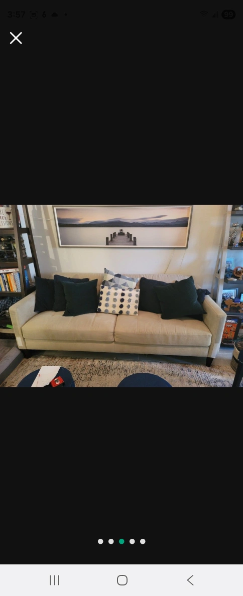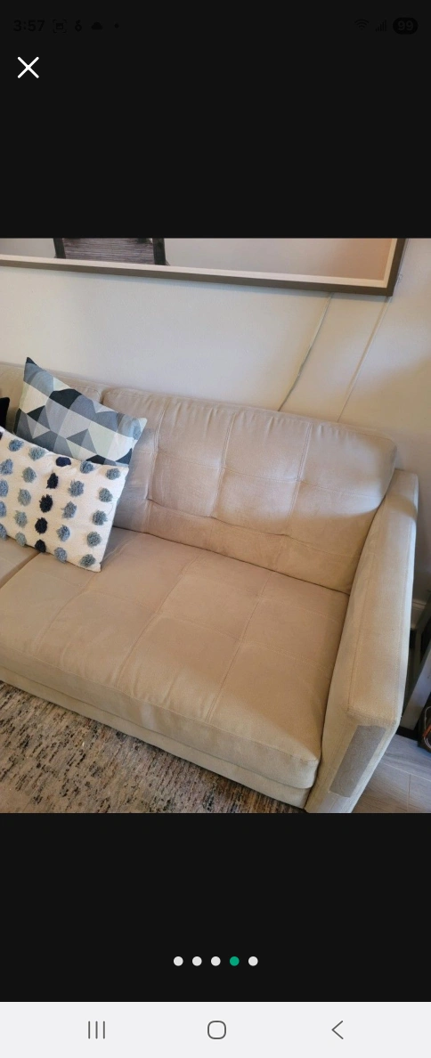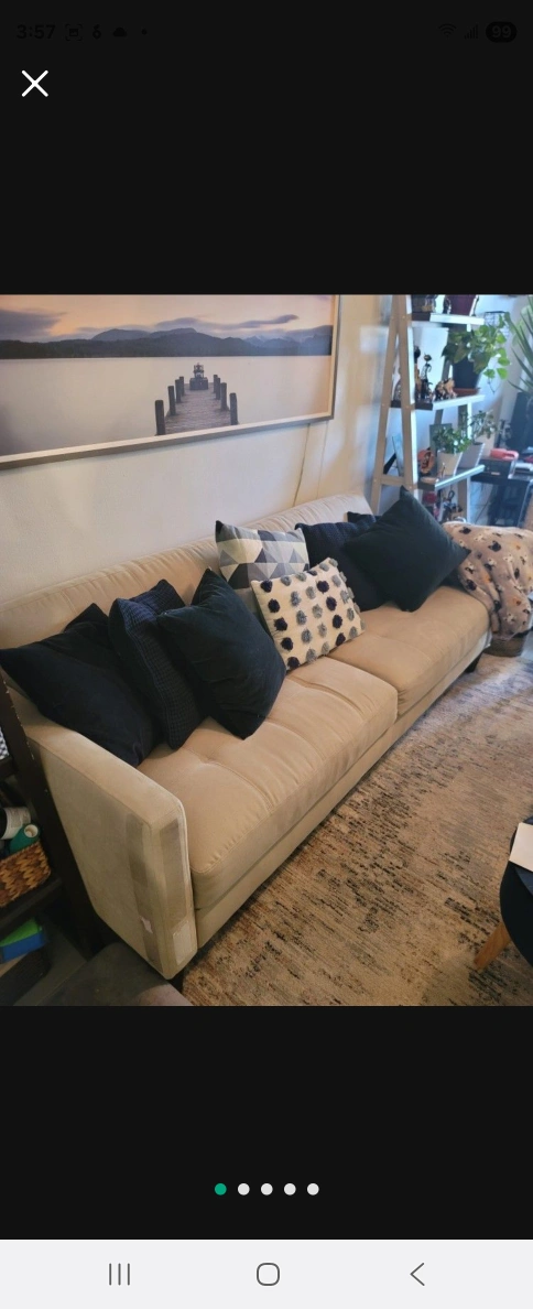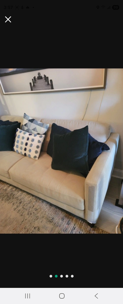 Couch with a cream-colored hue. Offers a sleek design. Includes several pillows. The perfect place to relax after a long day. MUST PICK UP BUT ALSO GIVE ME TIME TO GET APPROVED FROM BUILDING