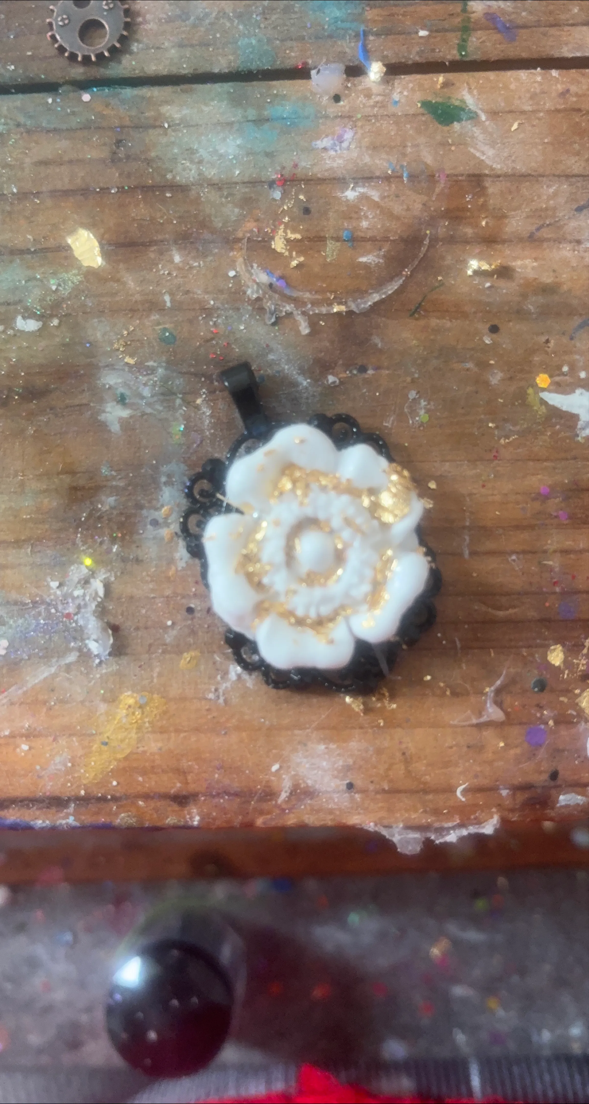 Floral pendant in white with gold accents. Features black detailing around the edges and a black metal loop to attach a chain. A beautiful piece to add to any collection to brighten up your day.