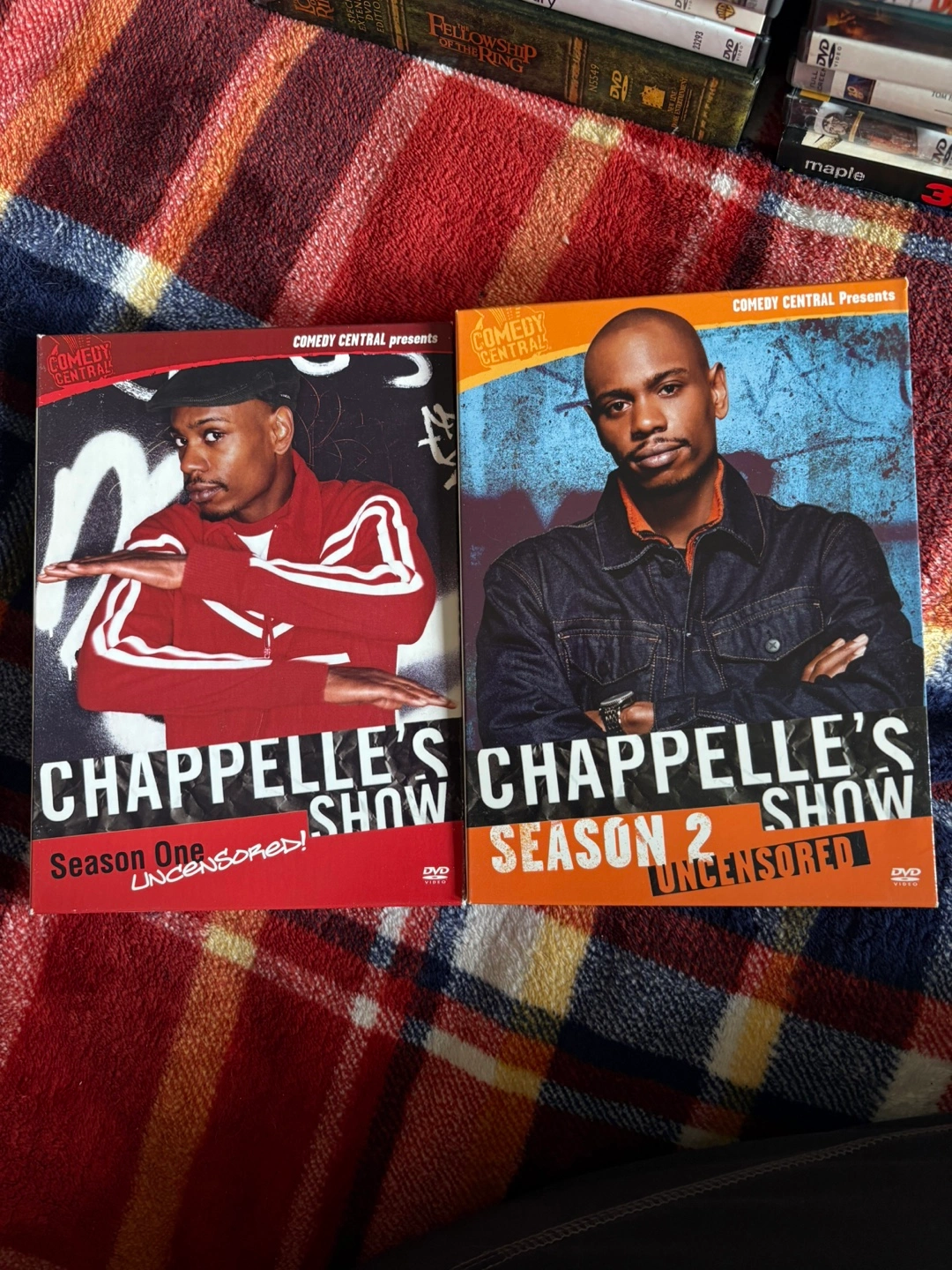 Two Chappelle's Show DVDs, Seasons 1 and 2. Season 1 in a red case, Season 2 in an orange case. Perfect for a cozy night in, or to gift to a friend, these DVDs are perfect for laughter.