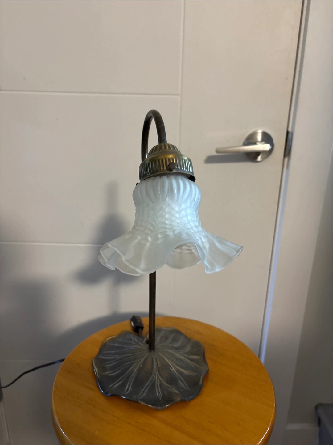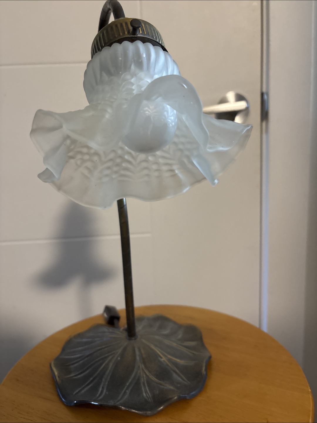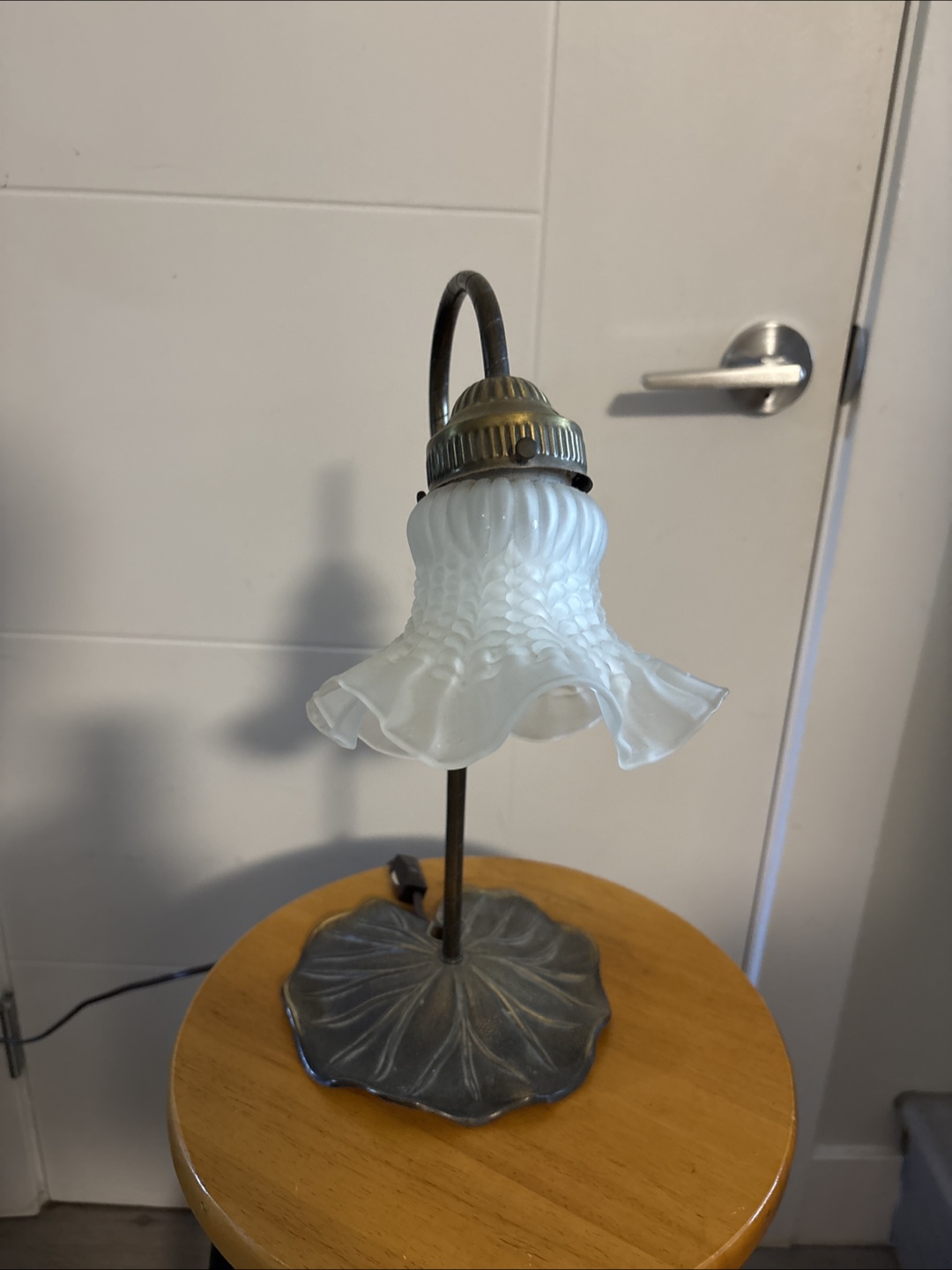 Antique lamp with a Brass base and a glass shade. The shade has a decorative design. Brass stem is curved, supporting the shade. This lamp is perfect for setting a relaxing mood.