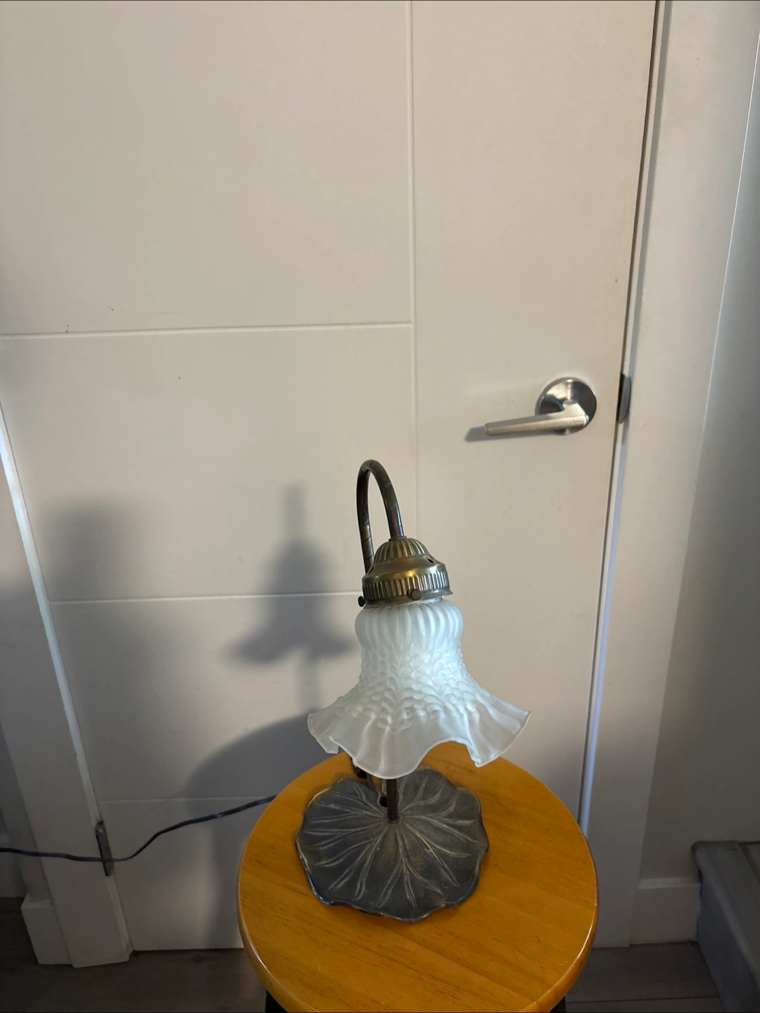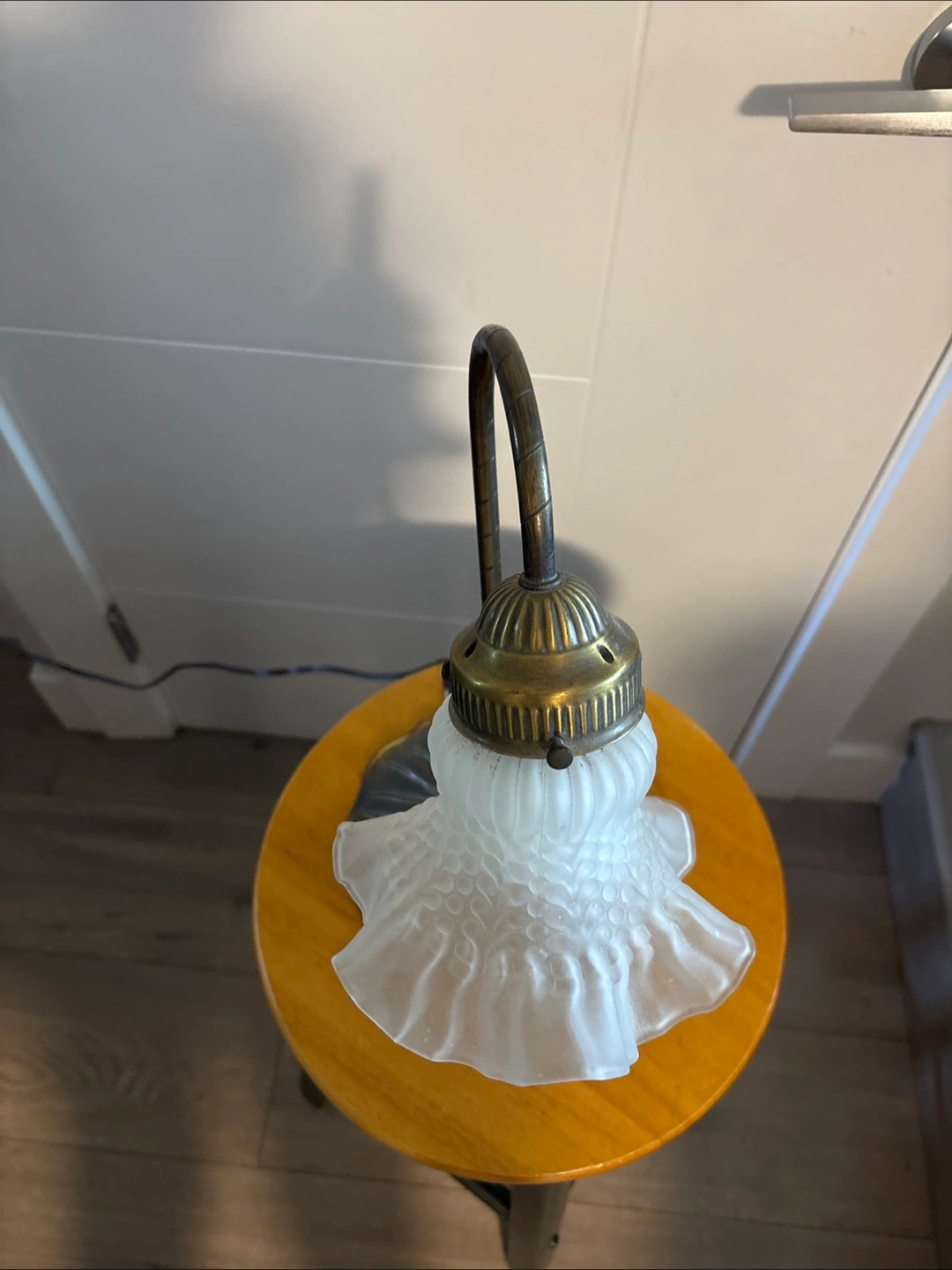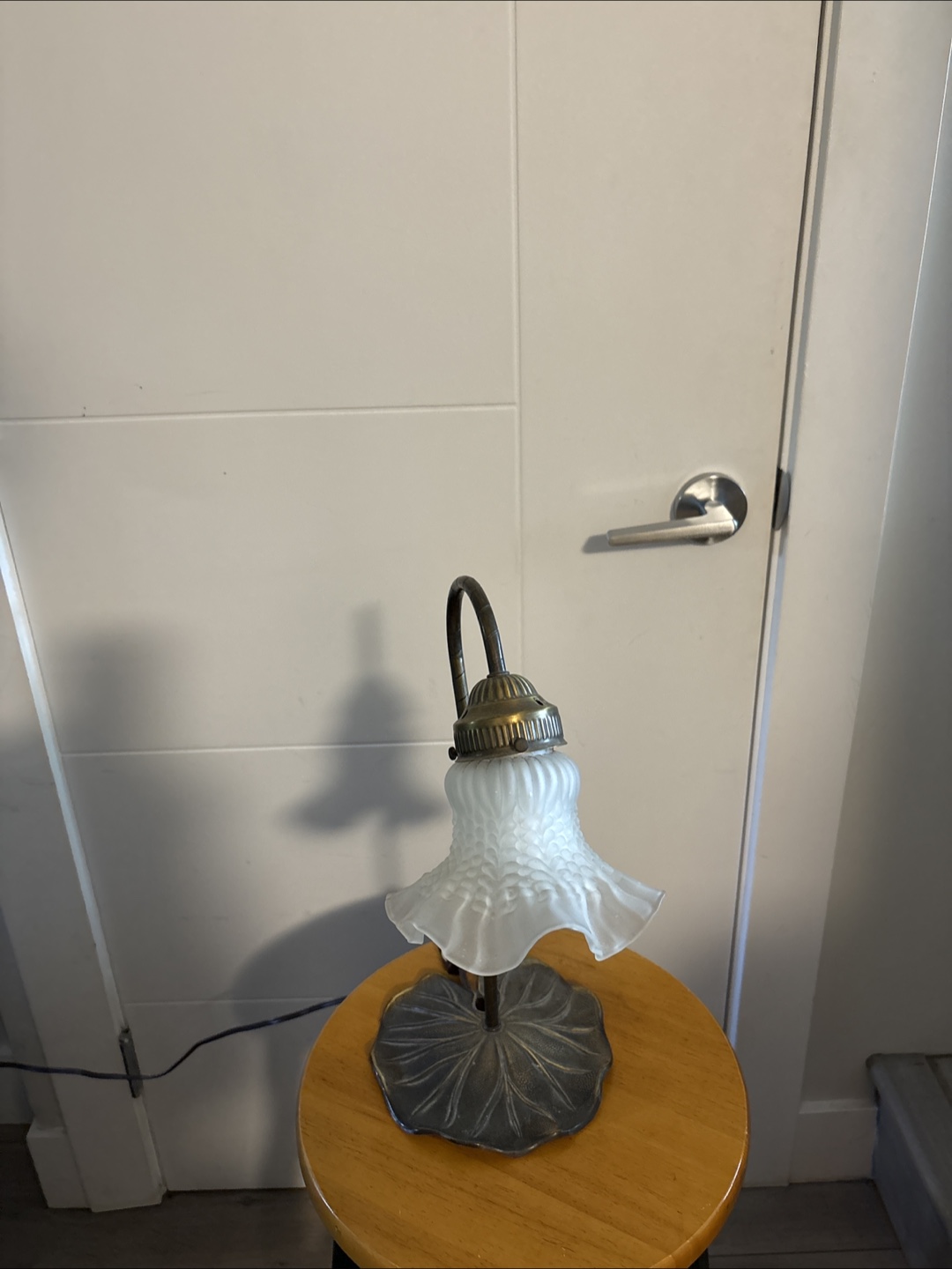 Antique lamp with a Brass base and a glass shade. The shade has a decorative design. Brass stem is curved, supporting the shade. This lamp is perfect for setting a relaxing mood.