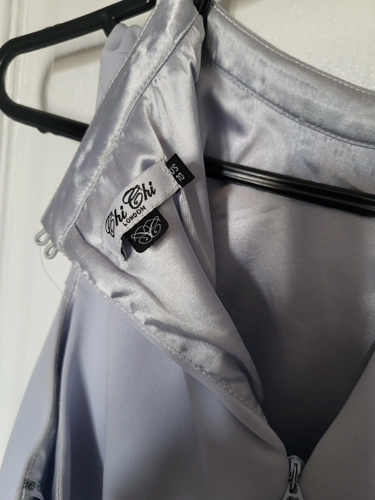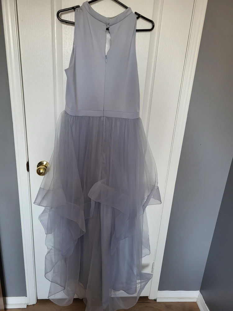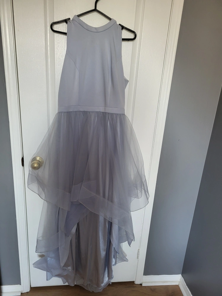 Elegant mauve (lilac) dress. Sleeveless style. Features a flowing, layered skirt. High neckline with a keyhole detail at the back. Perfect for any special occasion and wearing it will help you feel confident and beautiful.