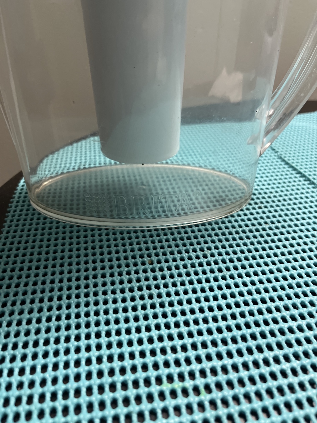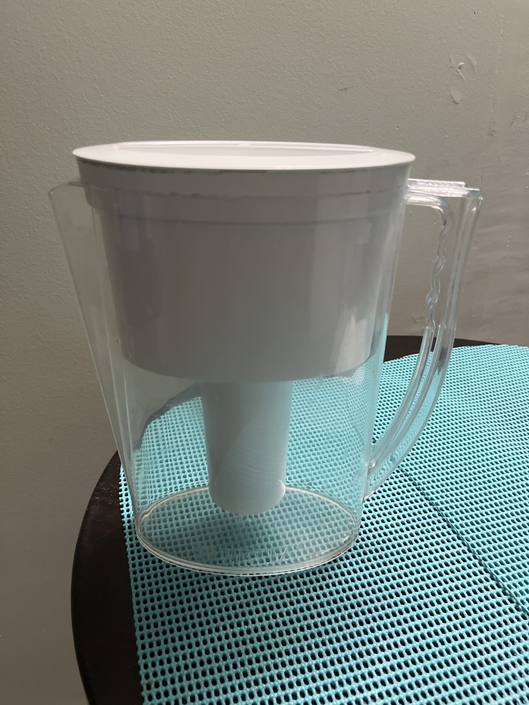 A water filter pitcher. Features a white reservoir and lid. Clear plastic body with a handle. This pitcher will help you stay hydrated and refreshed, bringing you a sense of peace.