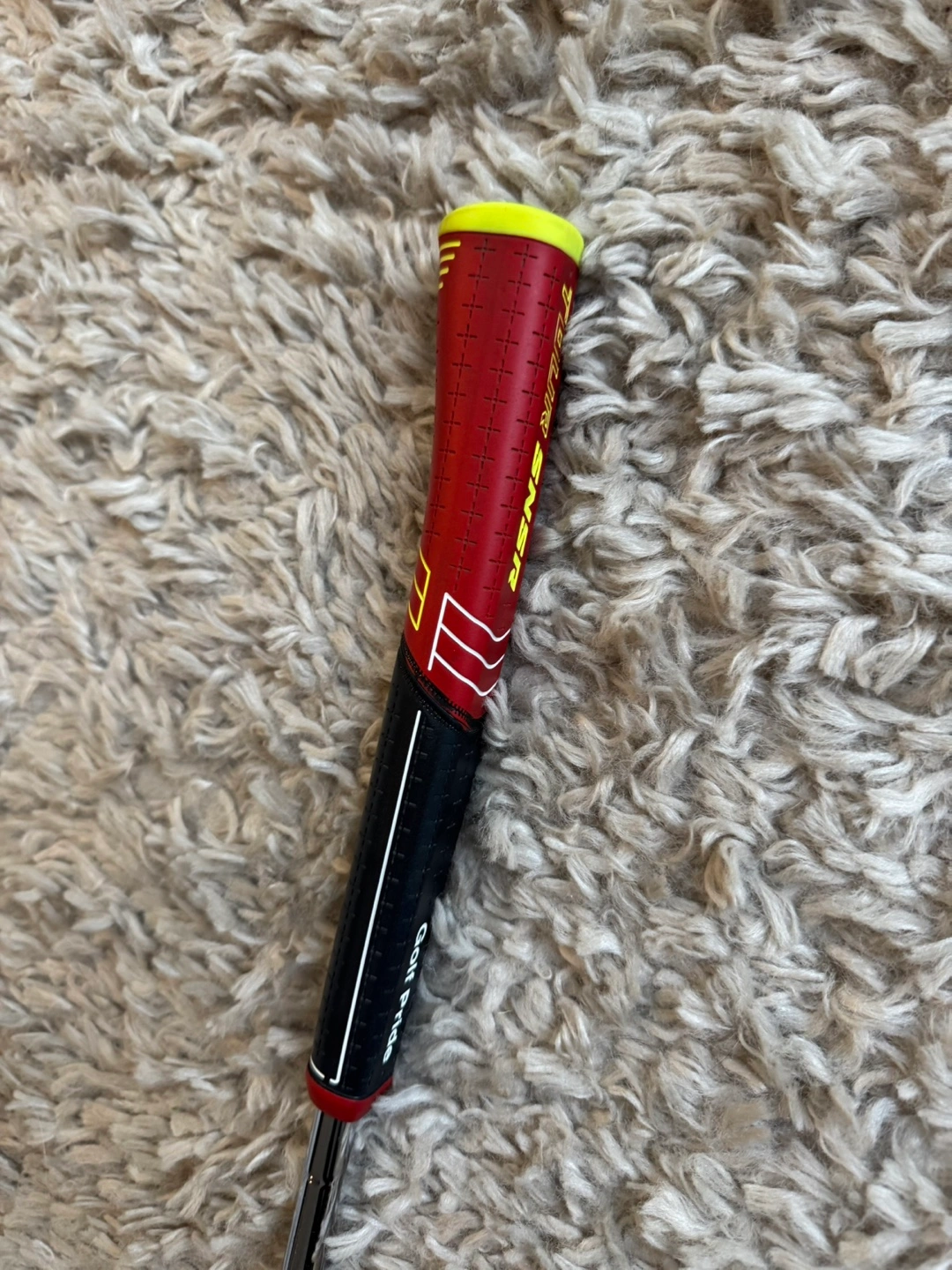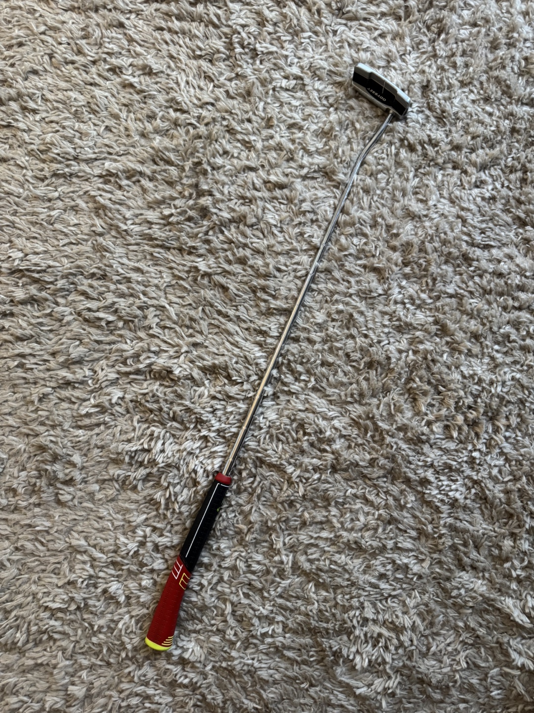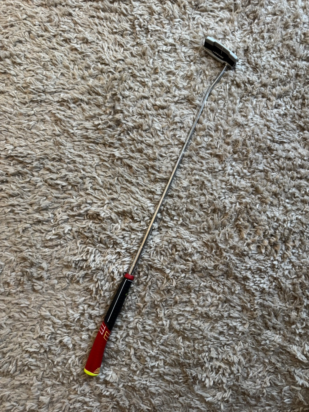 A beautiful putter with a long shaft. It features a red and black grip. A great item to have in your bag to keep your nerves calm when you're putting. Includes head cover. Right hand, 35 in.