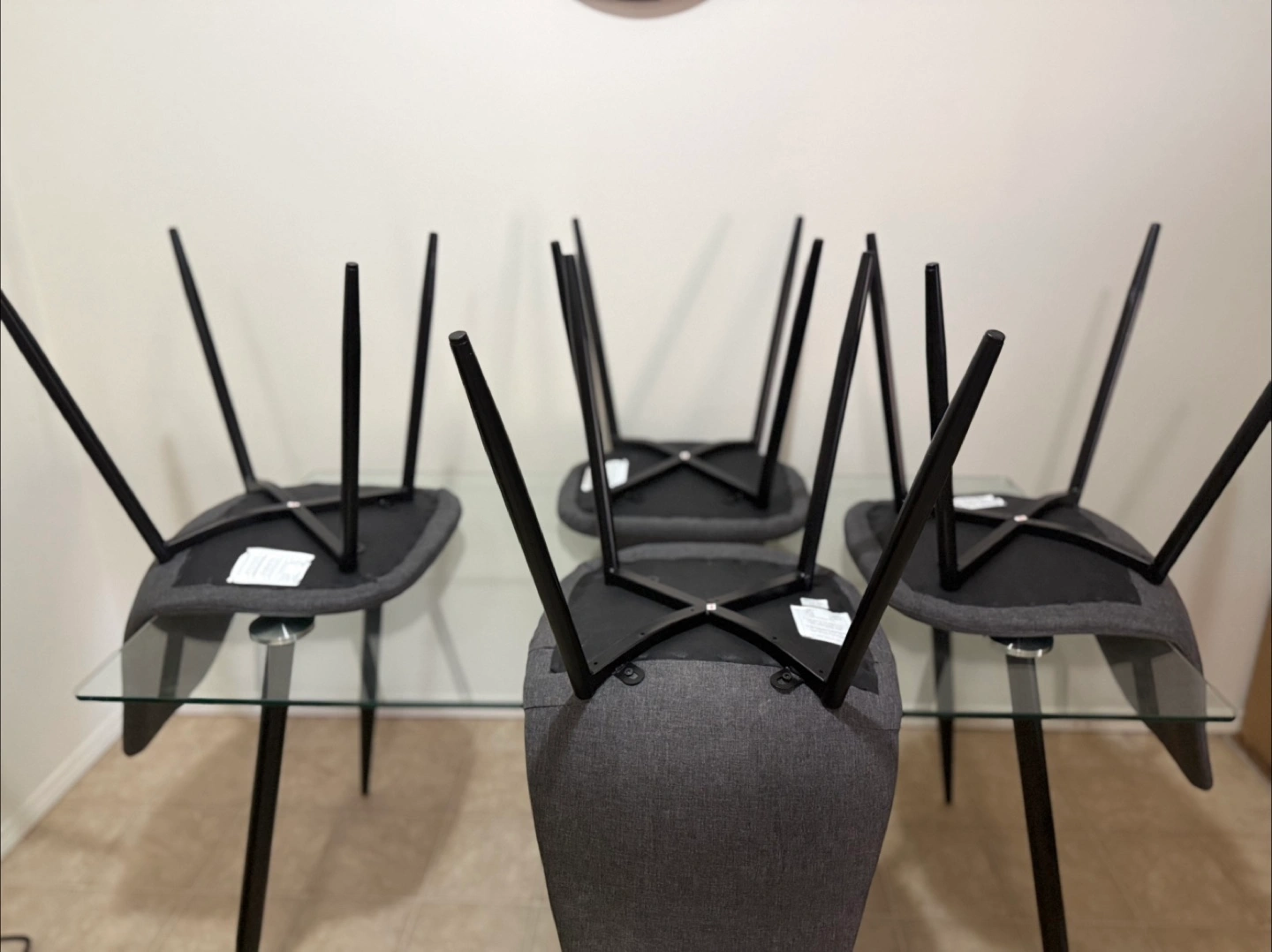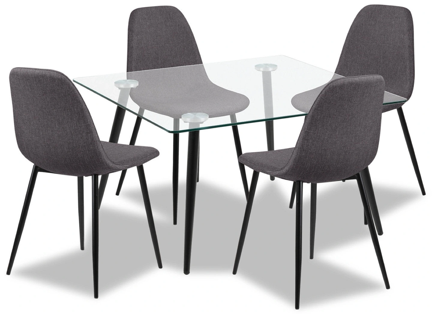 Set of four gray upholstered dining chairs . Black metal legs table. Comfortable seating for a dining area. These chairs and table will be the perfect addition to your home, where you can spend time connecting with loved ones and sharing stories over meals.
