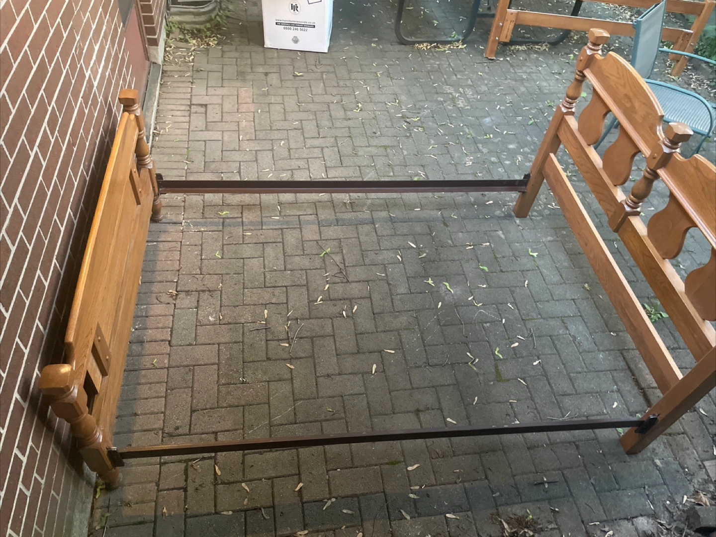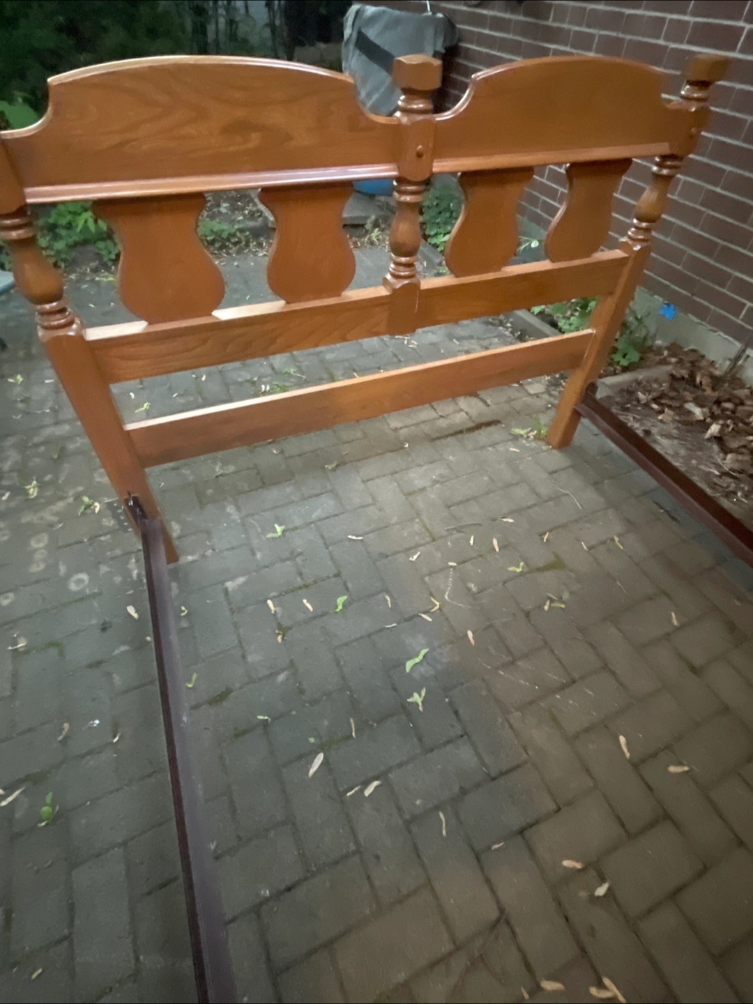 Wooden bed frame in a light oak finish. Manufactured by Krug. A quality Canadian furniture manufacturer. The headboard has a detailed, arched design. The frame is made with sturdy metal bars for support. Find a mattress and enjoy a restful night's sleep.
