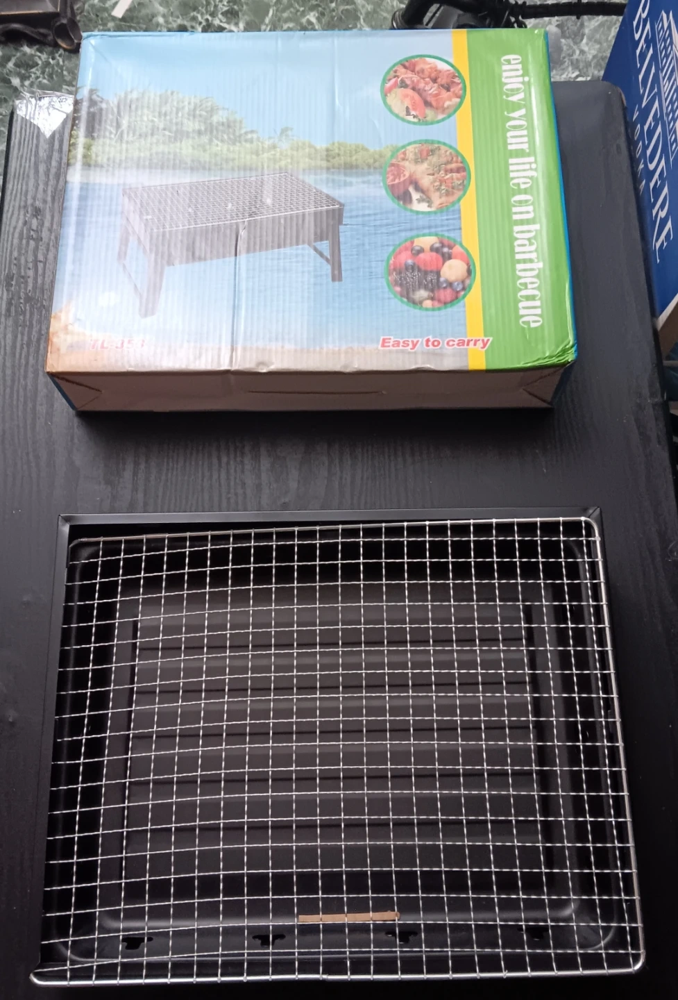 TLC small Portable charcoal Grill with metal grid on top. Sturdy legs. and carrying hook Great for outdoor cooking