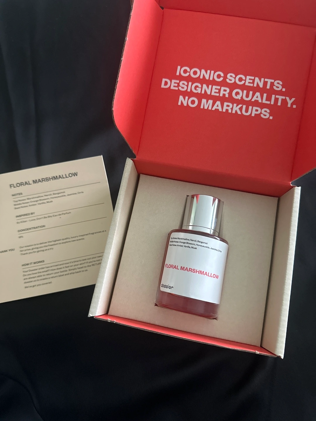 A perfume bottle and packaging are visible. The perfume is a fragrance called Floral Marshmallow, inspired by By Kilian's Love, Don't Be Shy.50ml/1.7oz