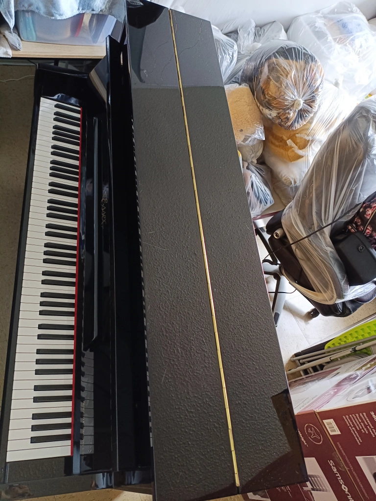 A piano with a glossy black finish. The keys have a classic appearance. Would be perfect for someone looking to learn to play a musical instrument.