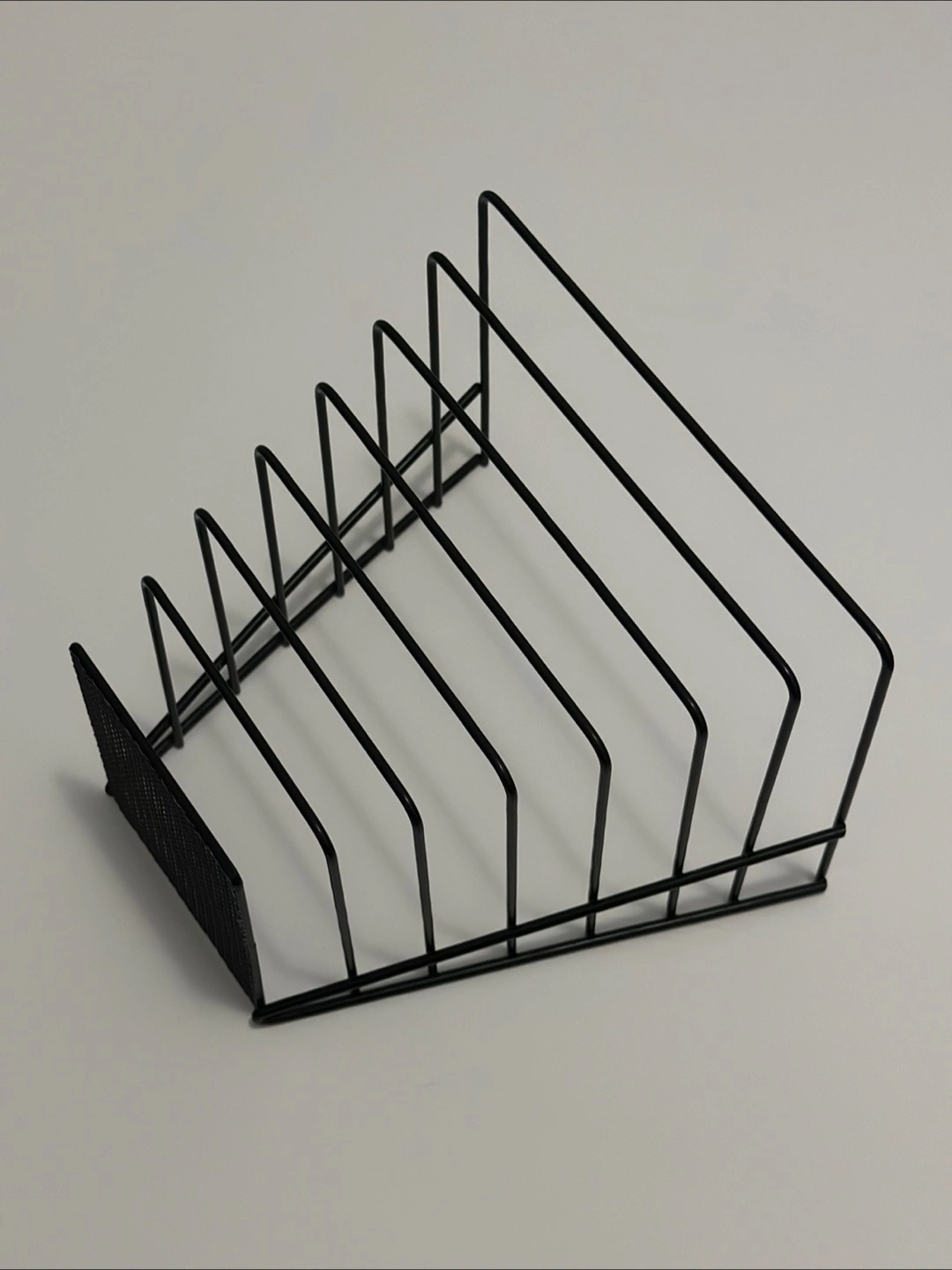 A black wire rack organizer. Features vertical dividers and a mesh section. Great for organizing documents or books in a neat fashion.