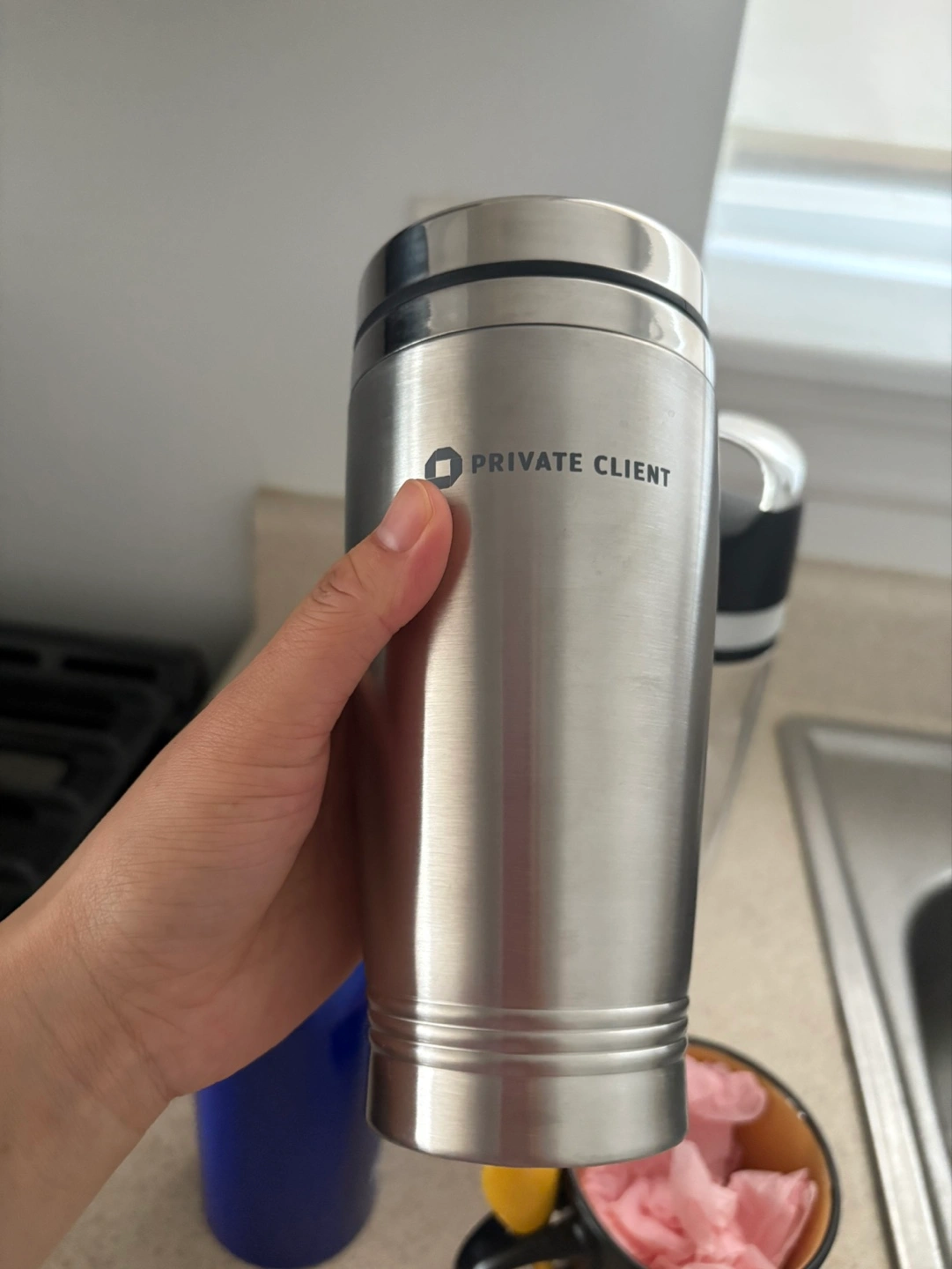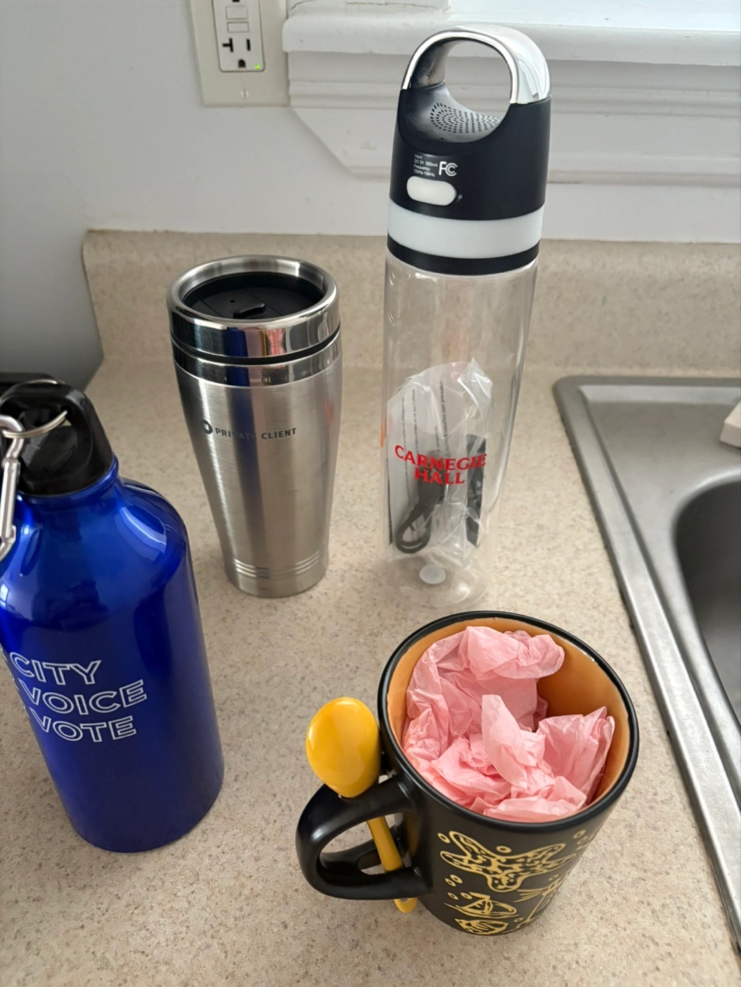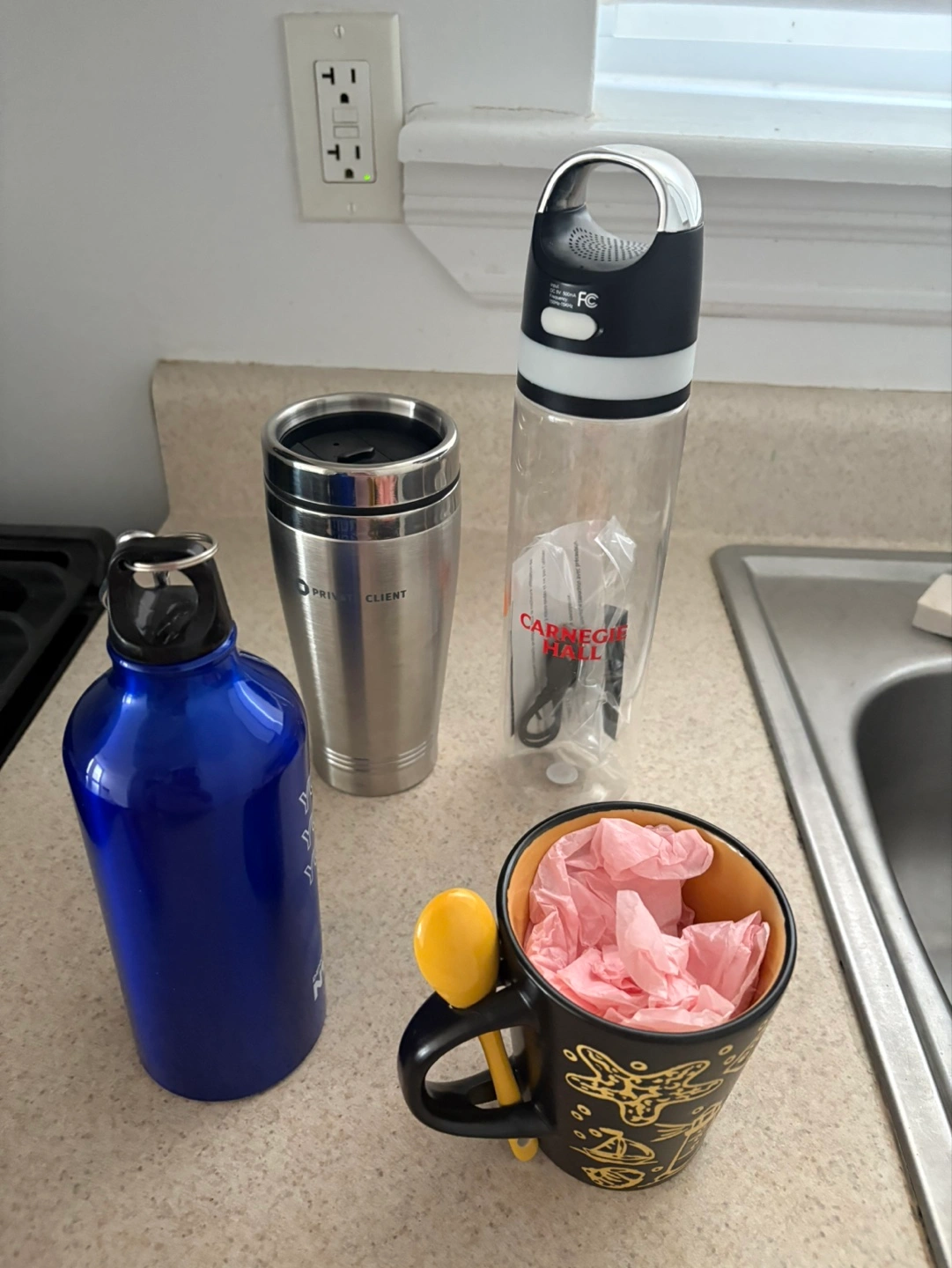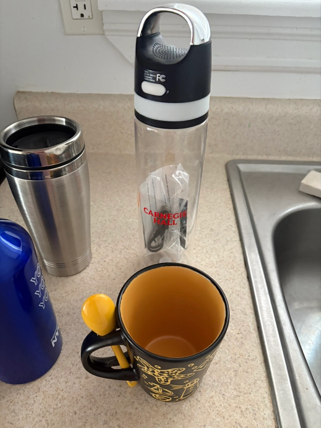The bundle includes a blue water bottle and a large metal travel mug. Also included is a Carnegie Hall water bottle and a mug with a yellow spoon. Start your day with a refreshing drink to help keep you relaxed.