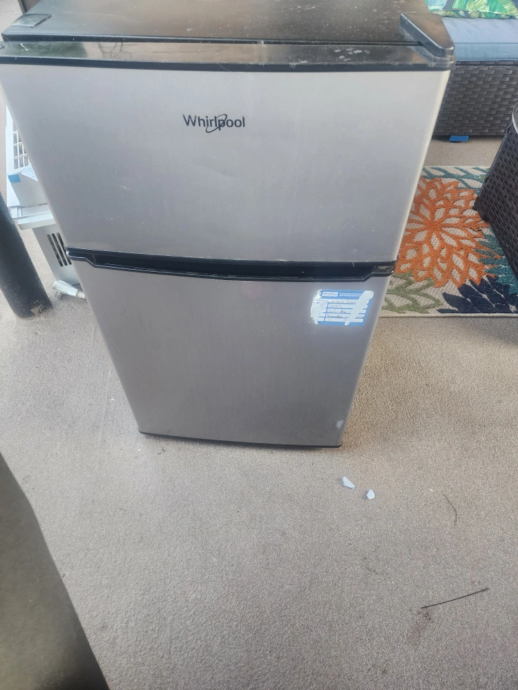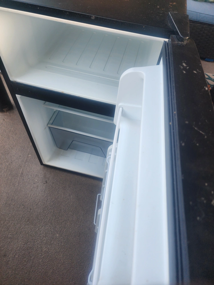 Mini fridge. Has a freezer on top. Interior with shelves. A small, personal fridge is a wonderful way to keep your favorite drinks chilled and at your fingertips.
