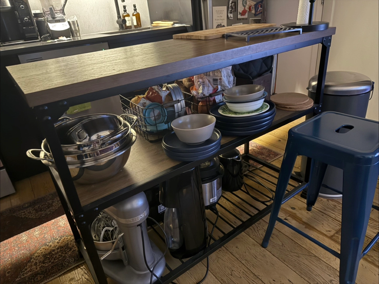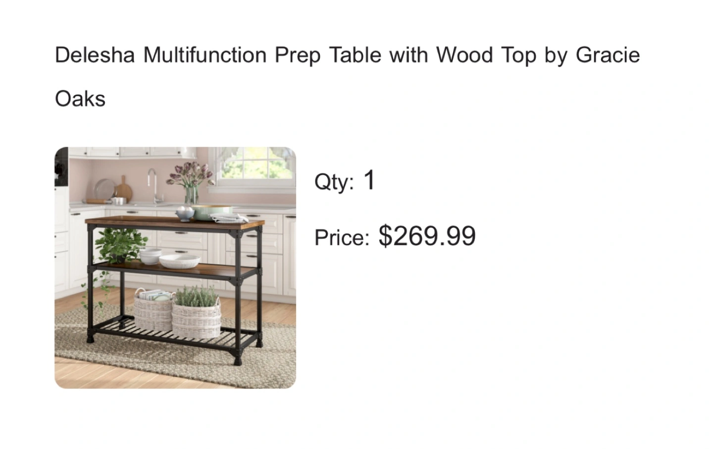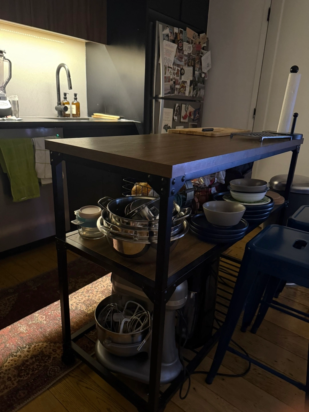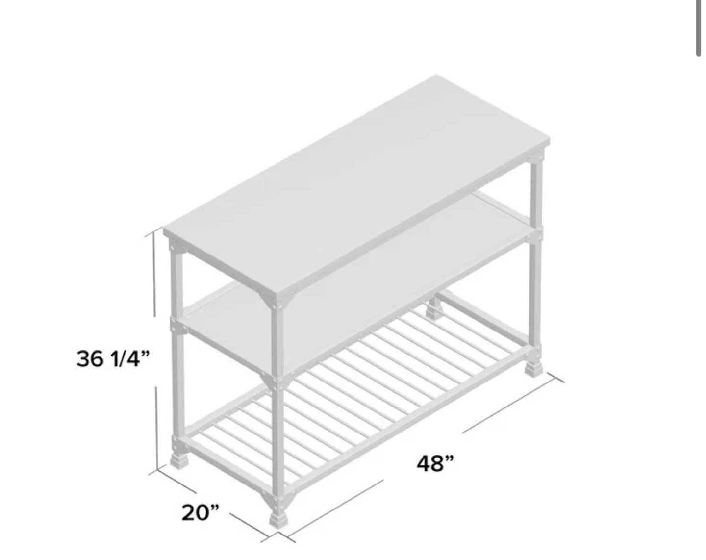 Prep table with a wood top. Metal frame. Features multiple shelves for storage.