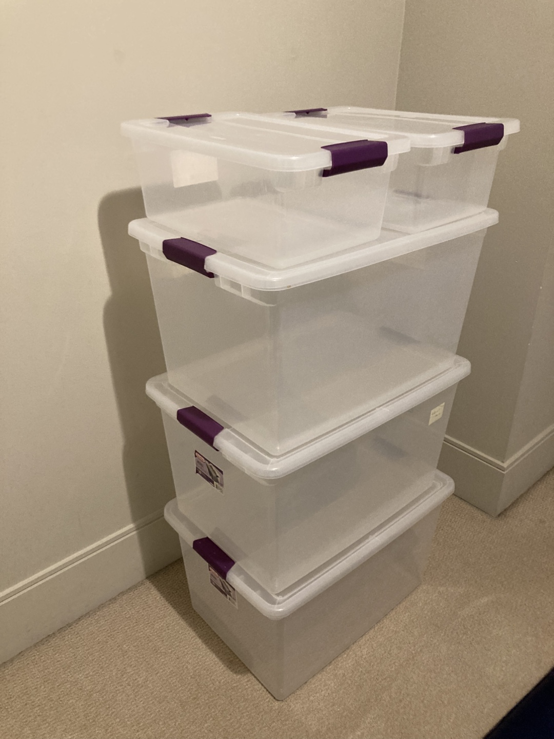 I am selling 5 clear plastic storage containers. They have latching lids and a transparent design.