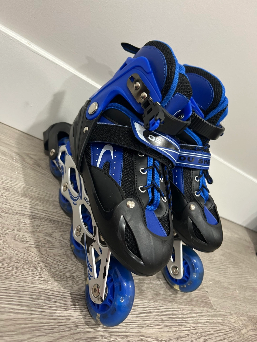 Moving Sale!! Available for pick up Stylish training rollerblades with adjustable setting. Features a blue and black colour scheme. Comes with safety gear (size small) and Allen keys Condition: Used once, can’t do it so I had to give up. Shoe size: EU 35 - 38 Safety gear included (pairs of: knee pads; elbow guards; and, palm guards)