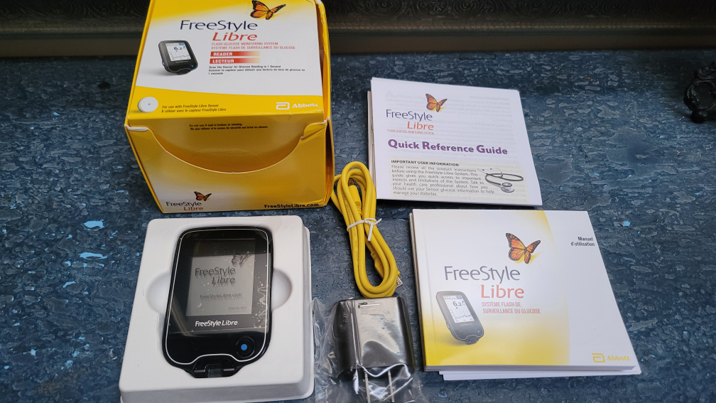 A FreeStyle Libre reader with accessories, including full munal instruction booklets, a charging cable, and a charger. A handy item for health management, it can bring peace of mind.