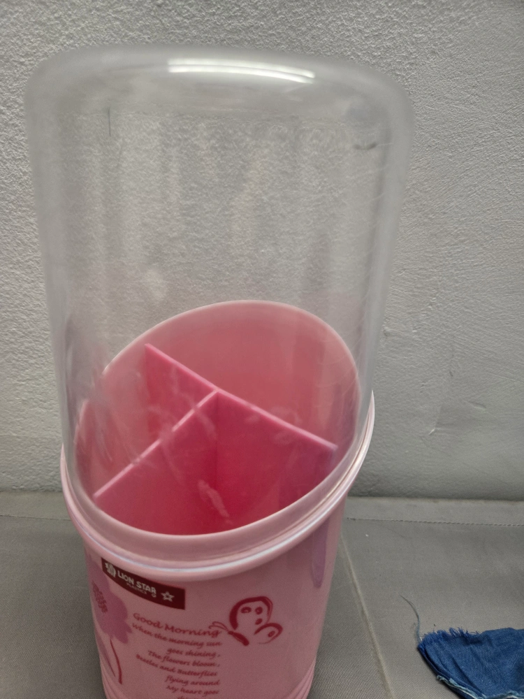 Pink storage container with a clear lid, with separated compartments inside. A lovely item to keep your desk clean.