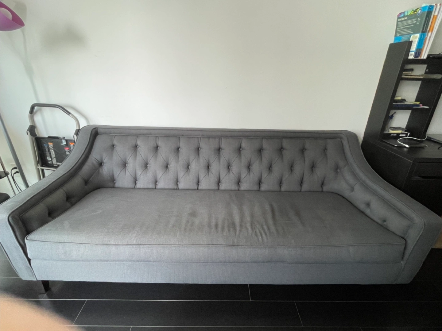 A beloved dark grey Structube sofa with tufted detailing on the backrest. Features a long seat cushion. Designed with gently curved arms and angled legs.