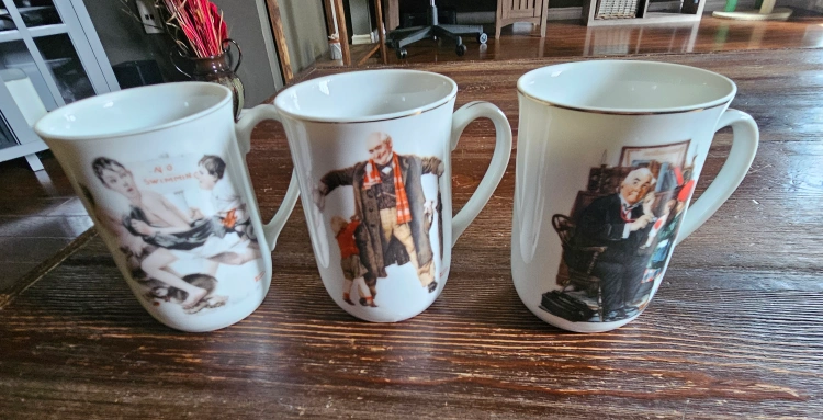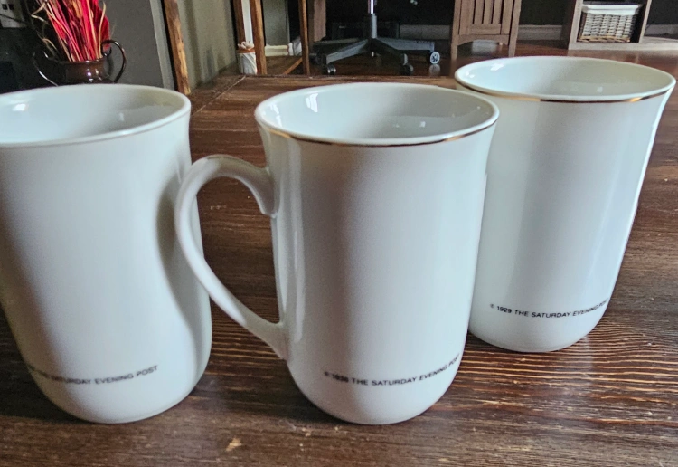 Beautiful porcelain mugs with interesting art and gold trim. Feature different images. Mugs have handles. The Saturday Evening Post Edition. Norman Rockwell.