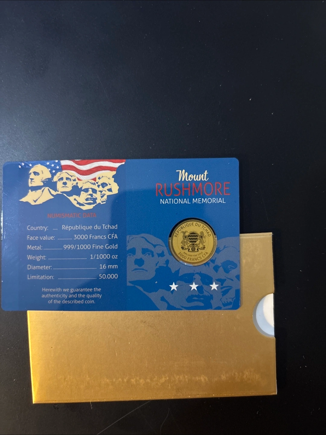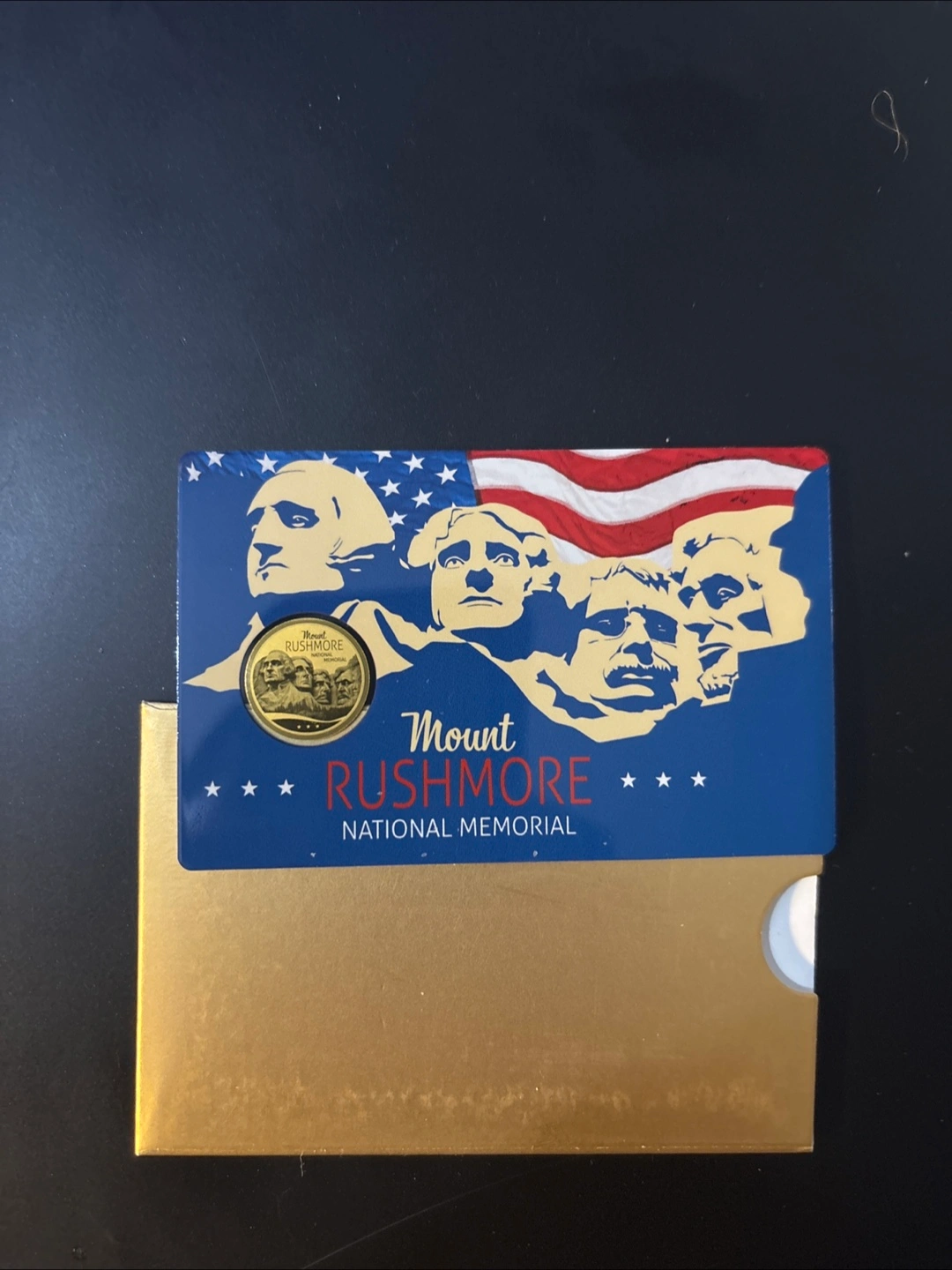 A unique coin with a golden shine, featuring the faces from Mount Rushmore. It comes inside a gold colored box, offering a nice display. It would make a great addition to any coin collector's display.