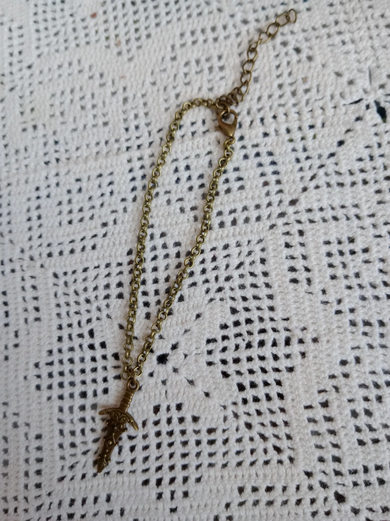 This Bronze Sword bracelet is a unique and eye-catching accessory, perfect for adding a touch of medieval flair to any outfit. This bracelet features a detailed sword pendant on a bronze chain.