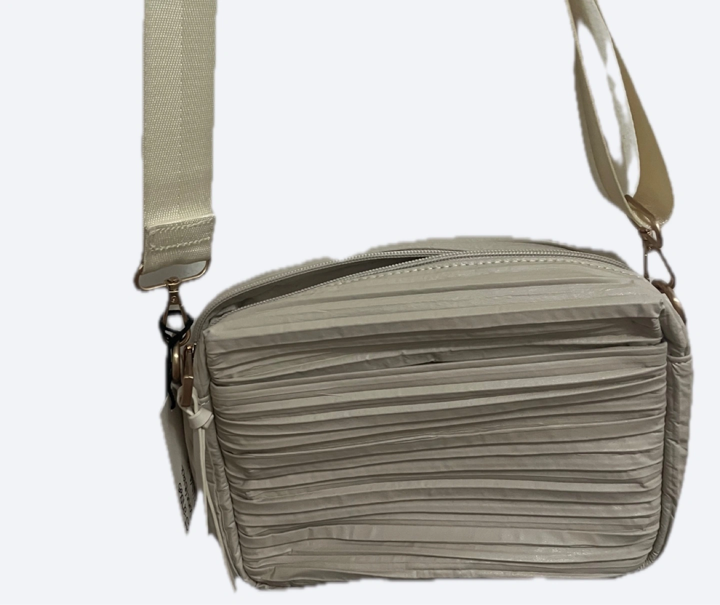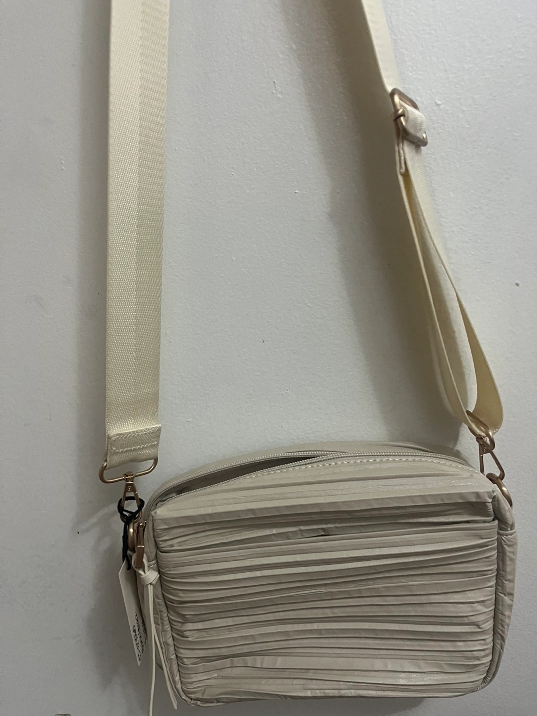 A crossbody bag in a neutral color. The bag has a pleated design. It has an adjustable strap, making it easy to carry. You could use this bag for keeping all of your essentials in one place and finding some peace of mind.