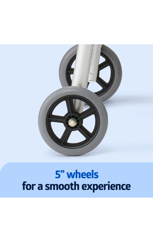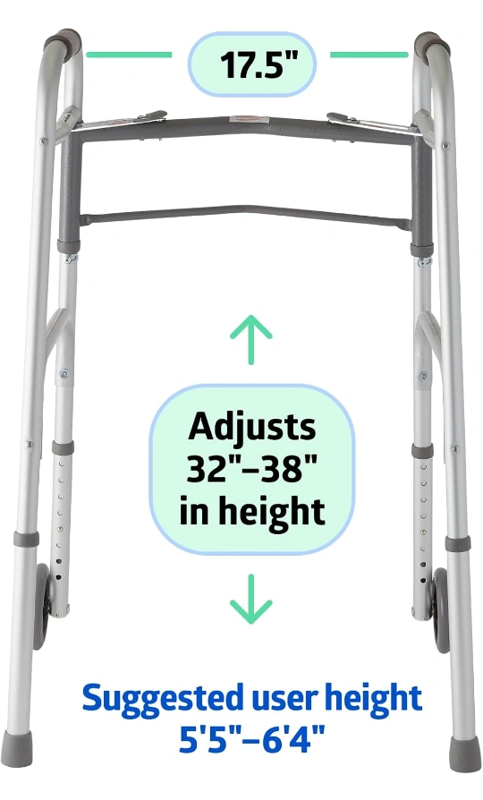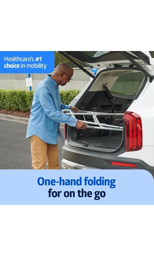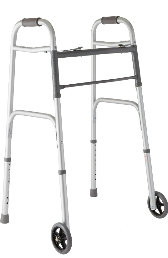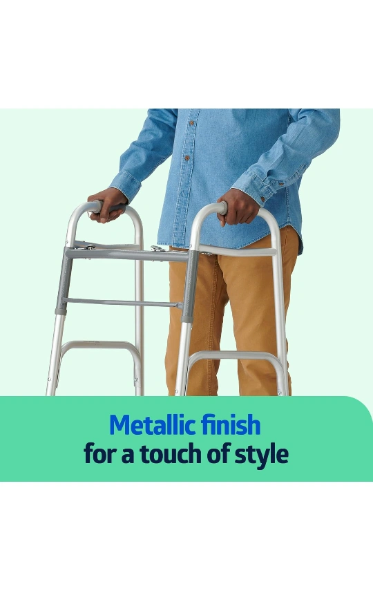 A folding walker with a metallic finish. The walker has wheels. It folds for easy transport. This walker can help make your life a little easier and bring you peace of mind.