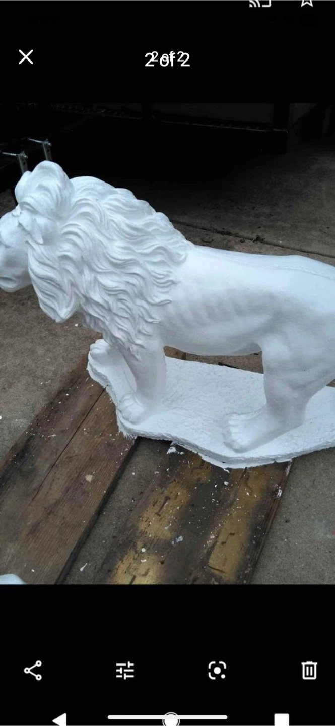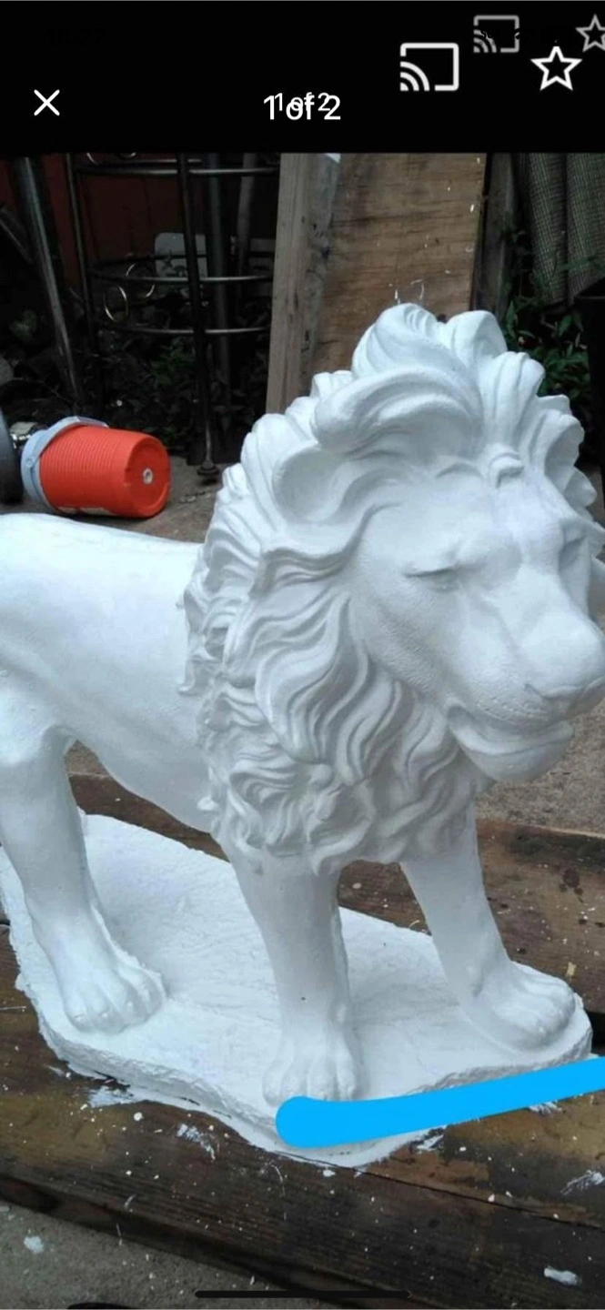 A majestic lion sculpture. It's solid white. Made from a sturdy Cement A great piece to add to your outdoor space, a calming focal point.