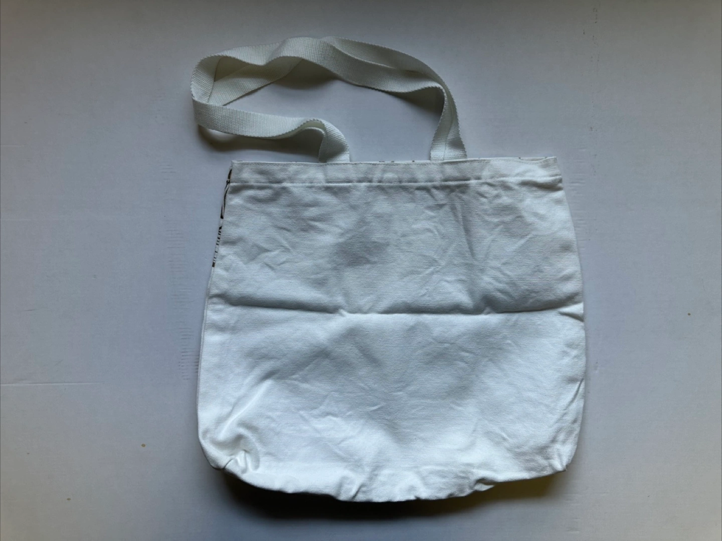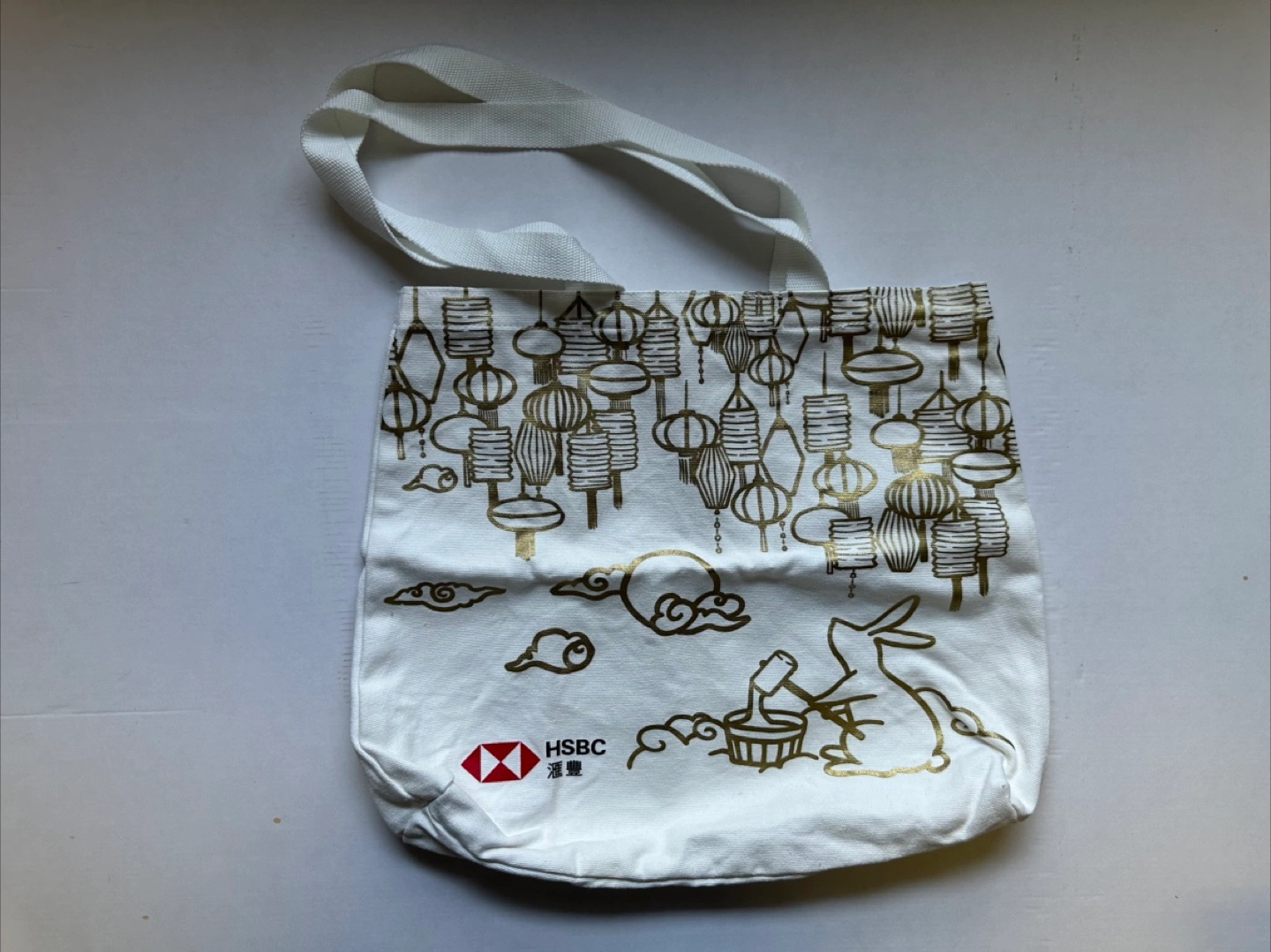 White canvas tote bag. Features an image of lanterns, clouds, and a rabbit. Includes a single handle. You can use this bag for everyday errands, taking your mind off of things.