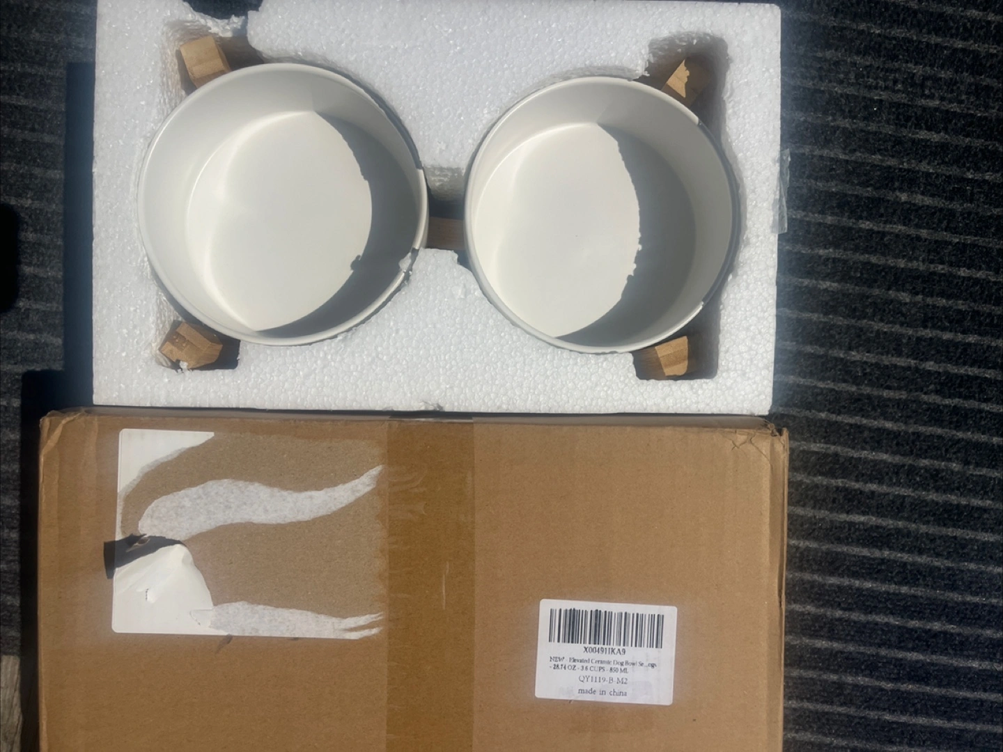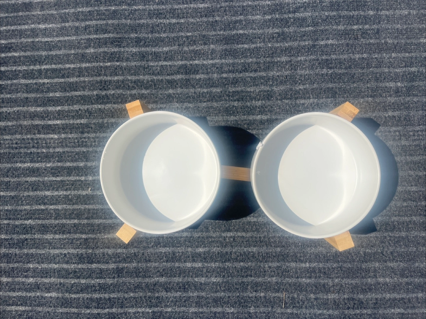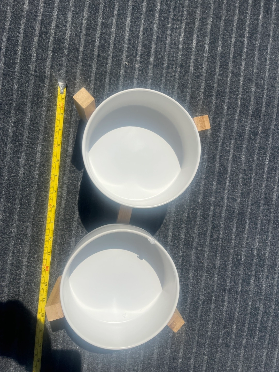 I am offering these elevated pet bowls. Two white bowls supported by a wooden stand. Perfect for your furry friend's food and water, making mealtime easier. These bowls are a wonderful addition to any pet owner's home for providing a stylish and functional eating solution.