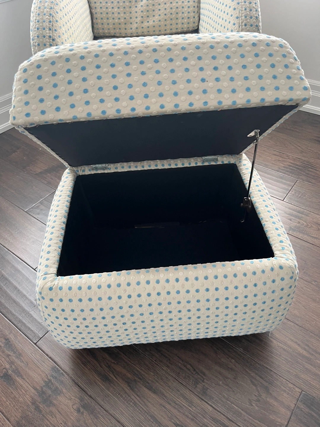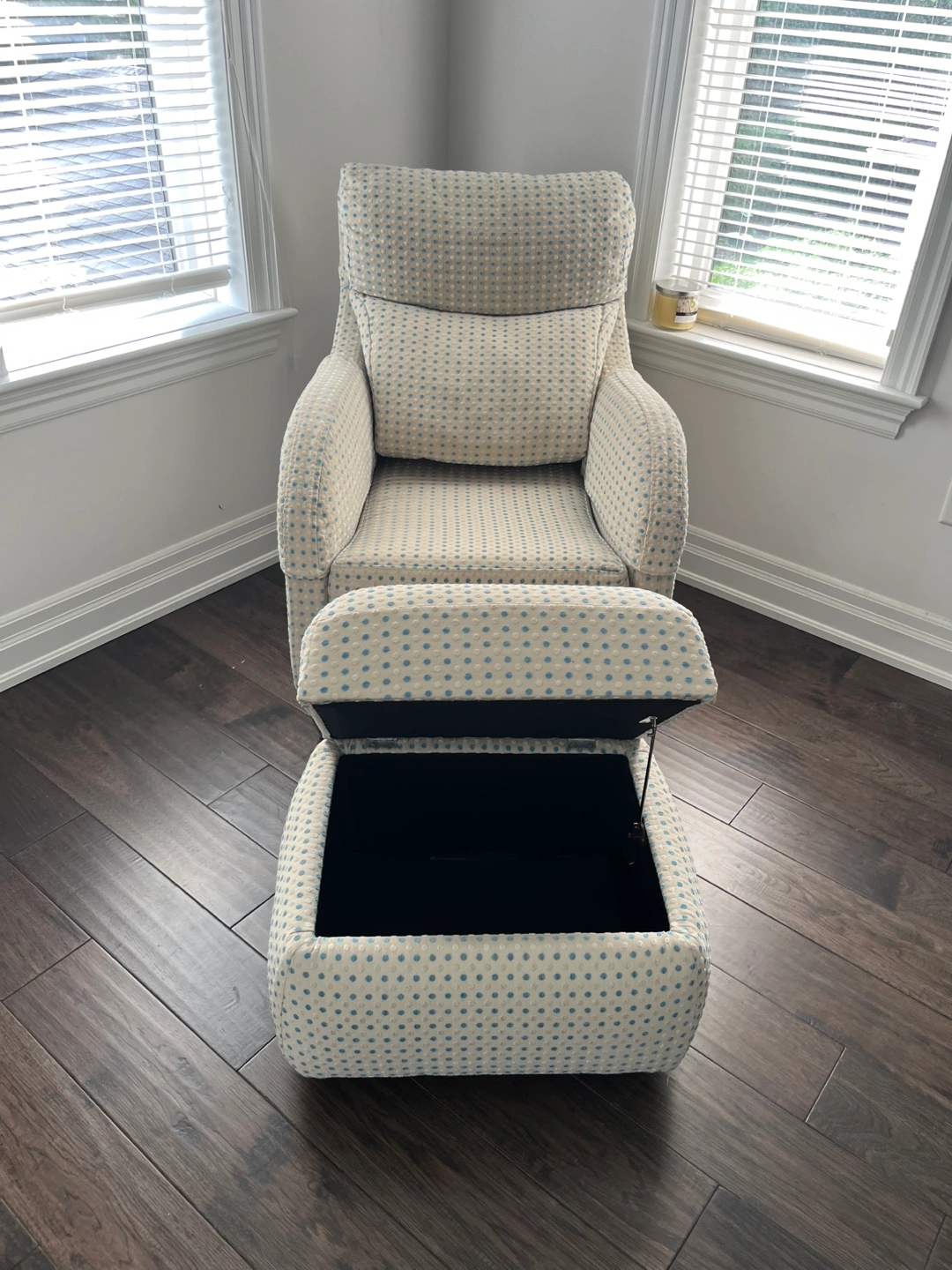 A lovely accent chair and ottoman set. Upholstered in a fabric with blue polka dots. Ottoman with storage space. It's a perfect set to relax in after a long day.
