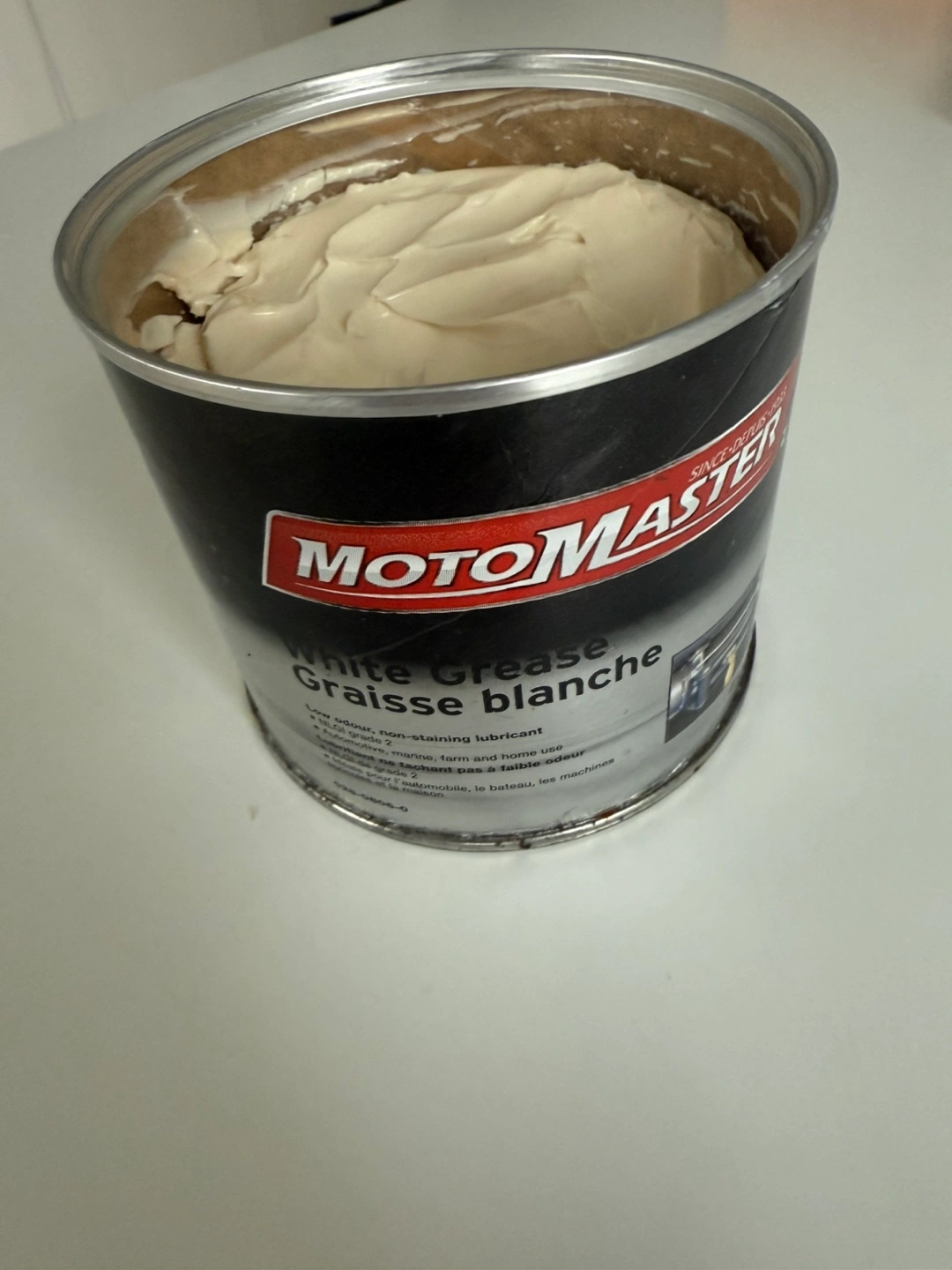 A container of white grease. The container is black with a red and white band on it. There is text on the side in both English and French. Consider this a great way to calm your mind and focus on what's in front of you.