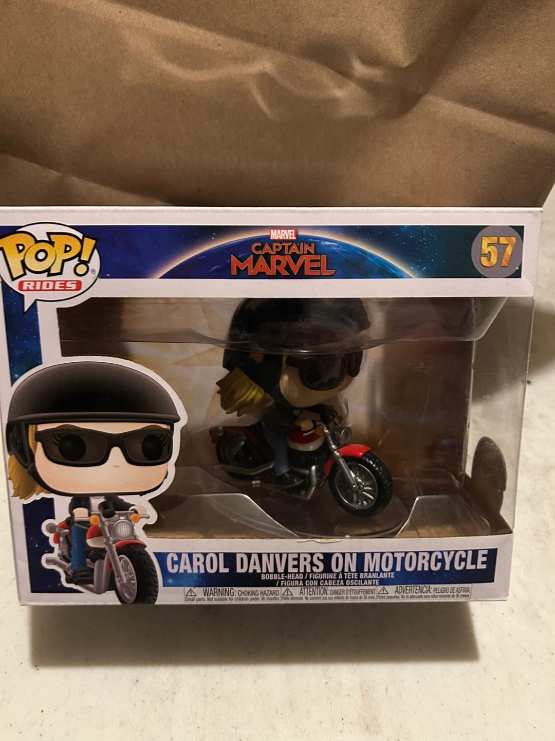 A collectible figure. Features Carol Danvers on a motorcycle. Box art features Marvel's Captain Marvel. Place it on your shelf and feel your stress melt away.
