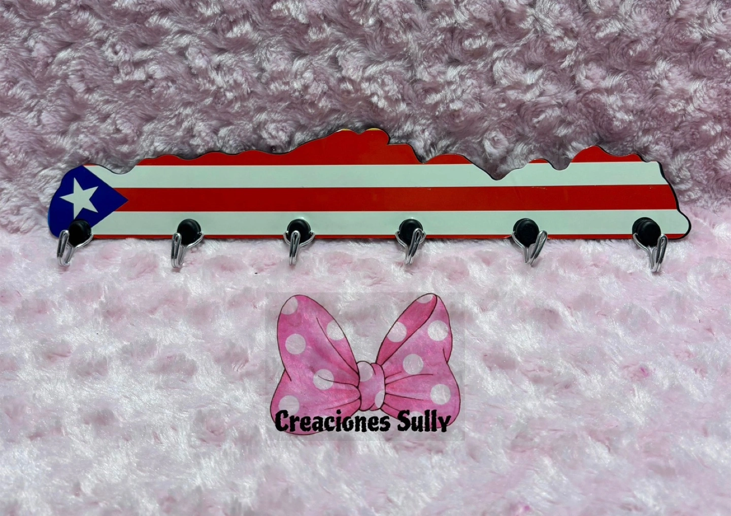 This key holder is in the shape of the island of Puerto Rico, with the flag design. Several key hooks are attached. A great place to hang your keys for an organized space.
