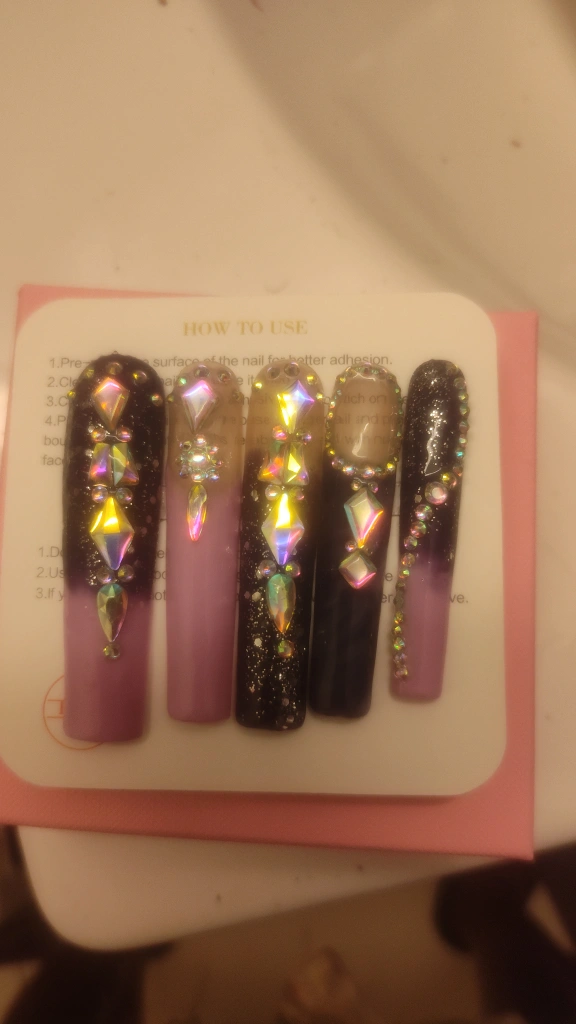 Selling a set of press-on nails featuring rhinestone accents! These nails have a unique design and are ready to use. Follow the instructions on the packaging for better adhesion and easy application. They are perfect for adding a touch of glam to your look!