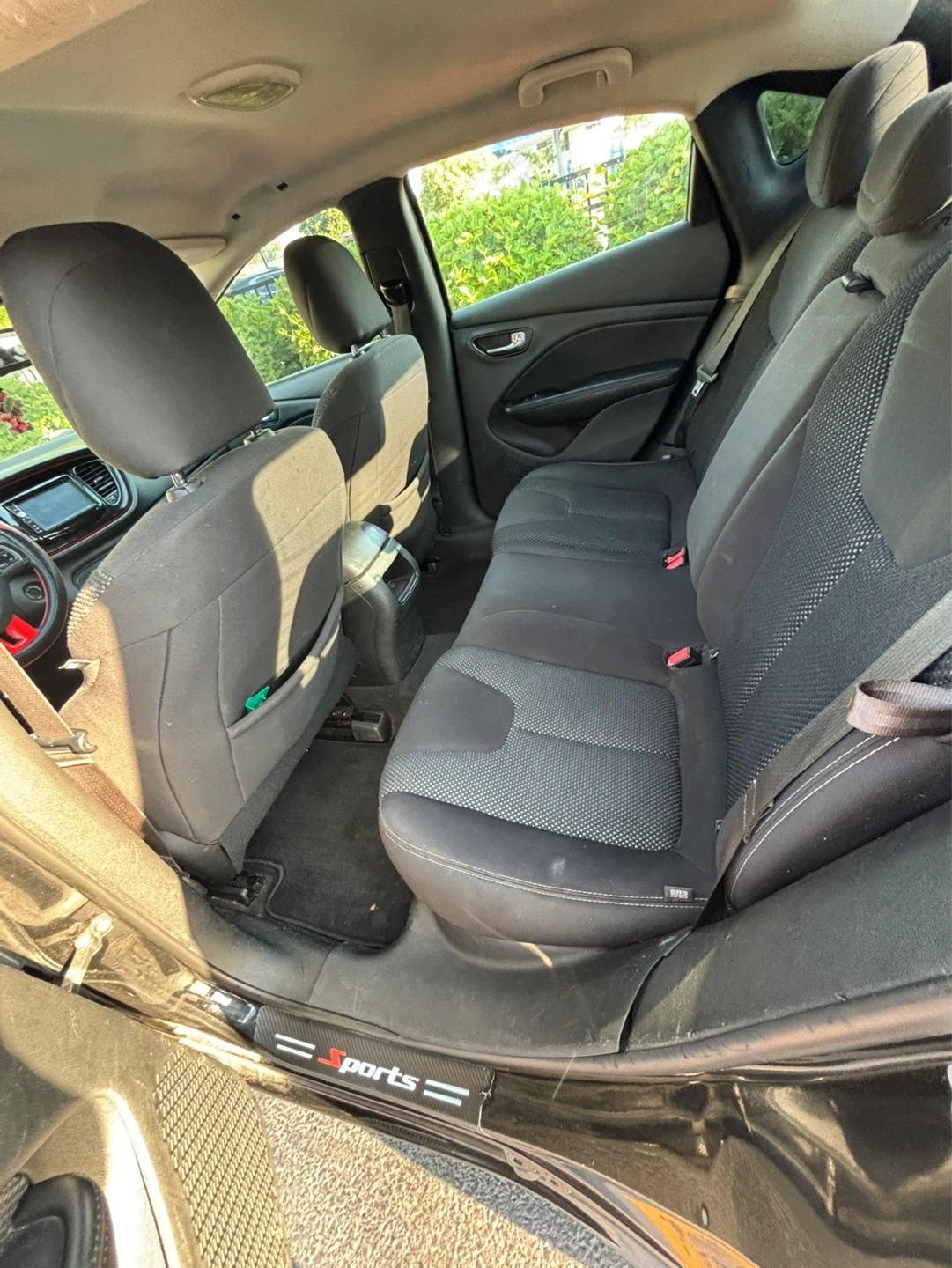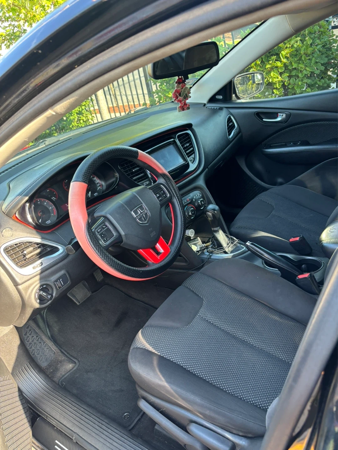 This black Dodge Dart SXT Sport has red racing stripes on the exterior and a matching red steering wheel accent. Interior features black fabric seats. This car's compact size makes it easy to maneuver. A great option for city driving!