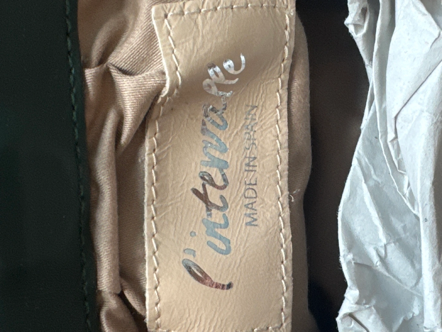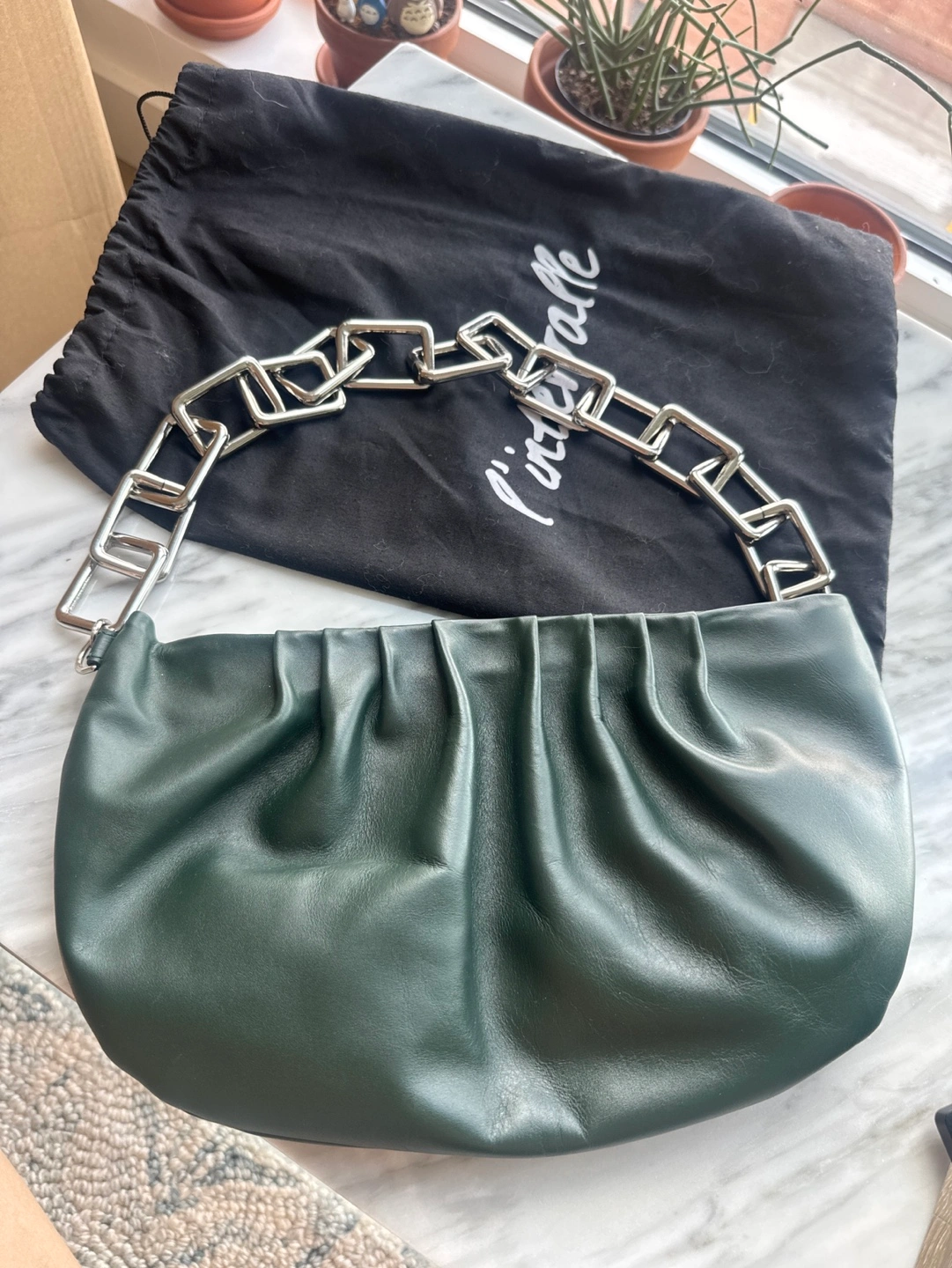 Beautiful dark green leather bag. Plush pleated design. Features a chunky silver chain strap. Made in Spain. Comes with dust bag.