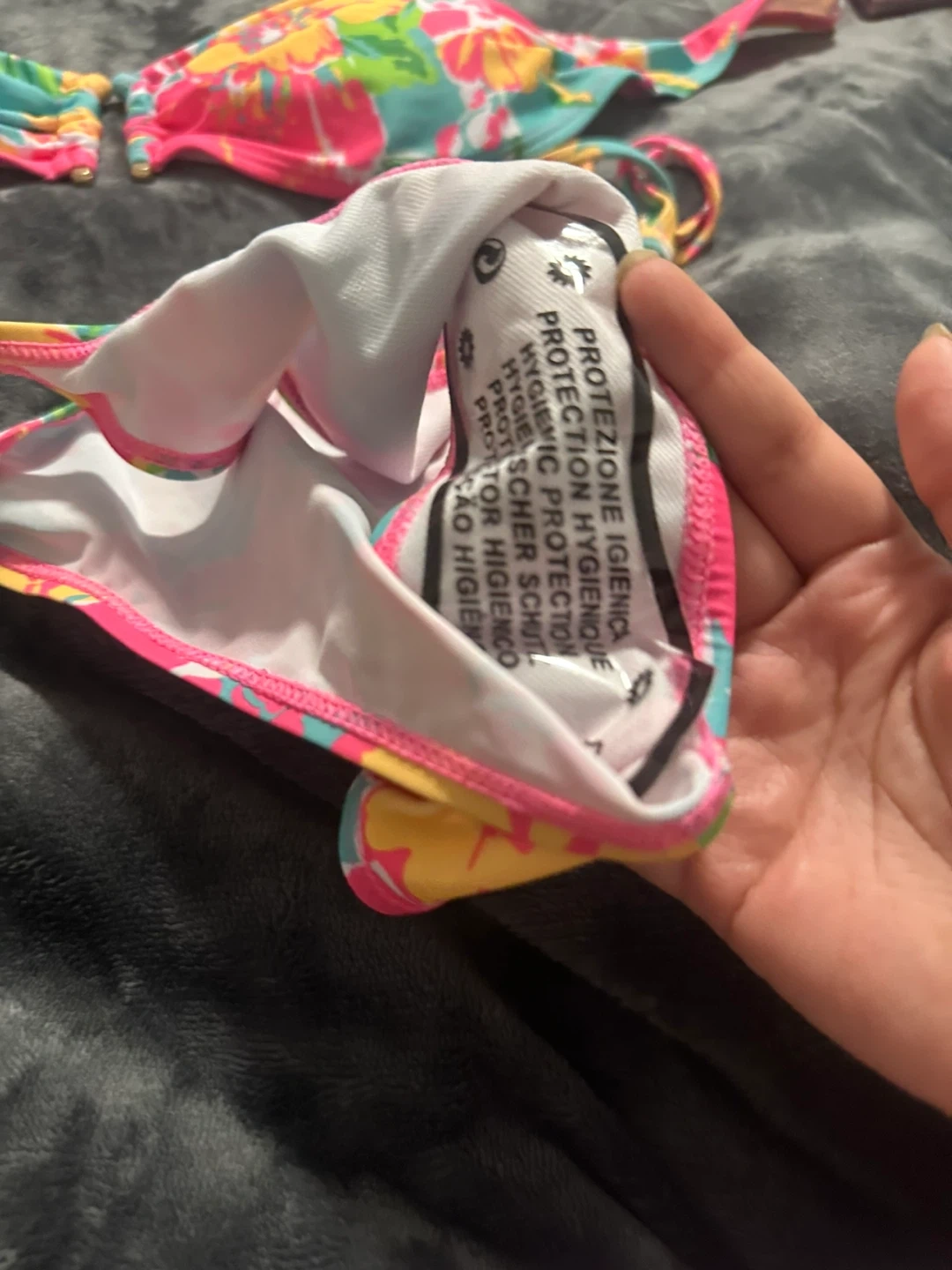 Bright and colourful floral print bikini set. It includes a strapless bandeau top and a tie-side bikini bottom. Made from a stretchy fabric for comfort.