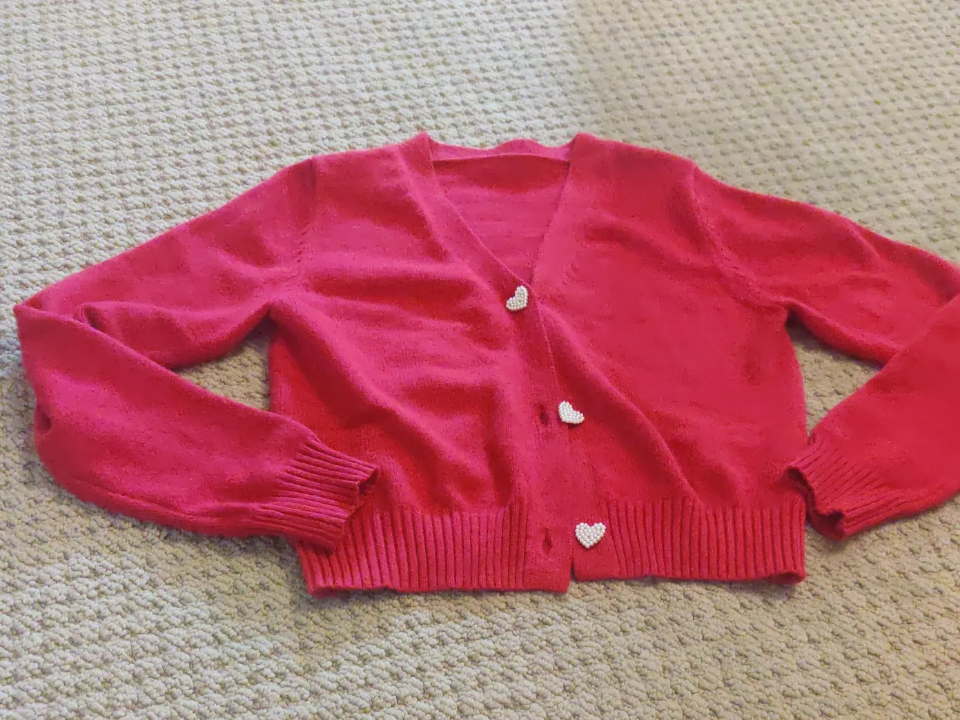 I am selling a red cardigan. Features heart-shaped buttons. It also has a V-neck. You can layer this cardigan over a cute dress for a cozy outfit. Pickup from Richmond.
