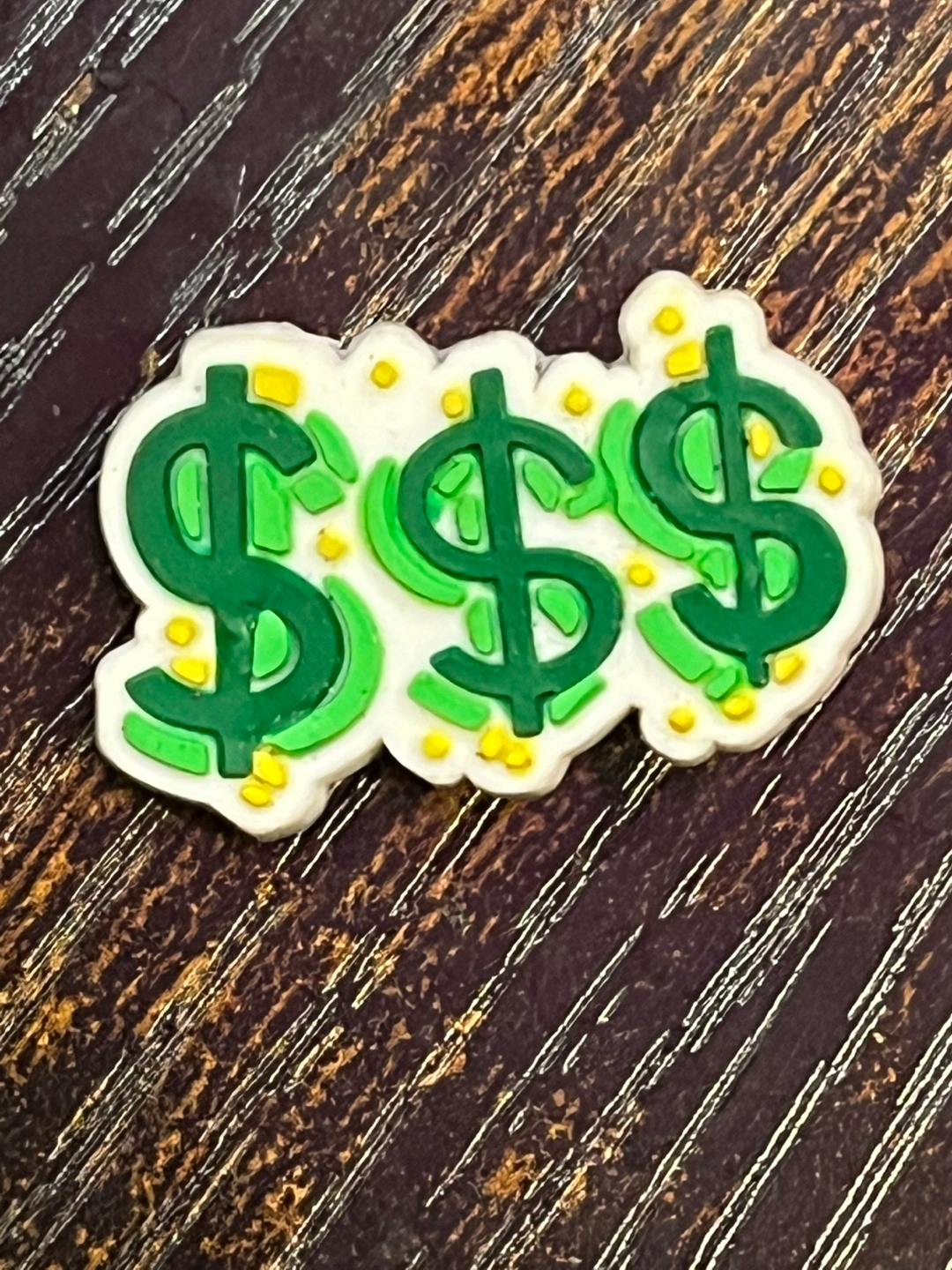 Dollar sign charm with a bright green color. Small yellow accents visible. You might like using this charm to accessorize your everyday style.